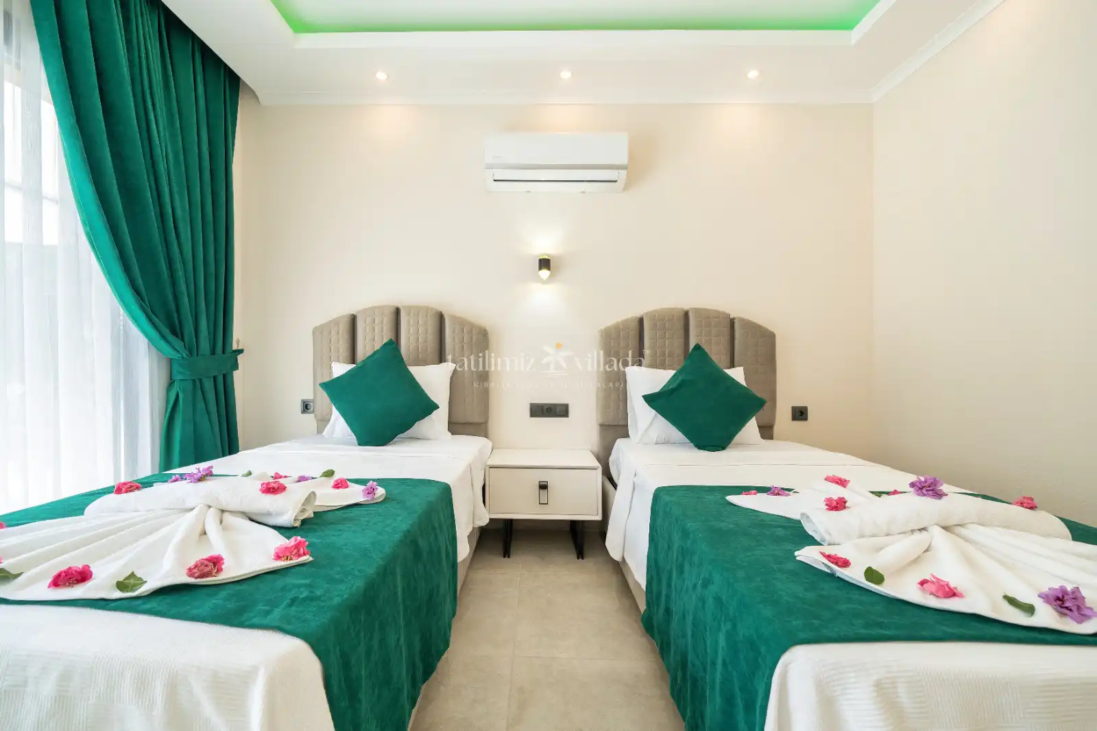 Modern iç tasarım ve her ayrıntının titizlikle düşünüldüğü dekorasyon, villamızda geçirilen her anı özel kılmaktadır. Yatak odaları, zarif mobilyalar ve konforlu yataklarla donatılmış olup, tatilin her anında rahatça dinlenmenize olanak tanır. Tam donanımlı mutfak ise, misafirlerimize evlerindeki rahatlığı sunmak için her türlü imkana sahiptir. Tatilinizi daha keyifli hale getirecek tüm olanaklar, villamızda bir araya getirilmiştir.