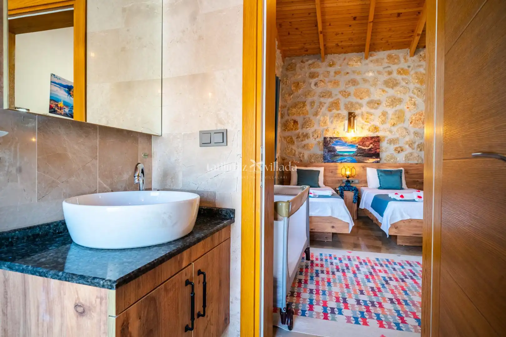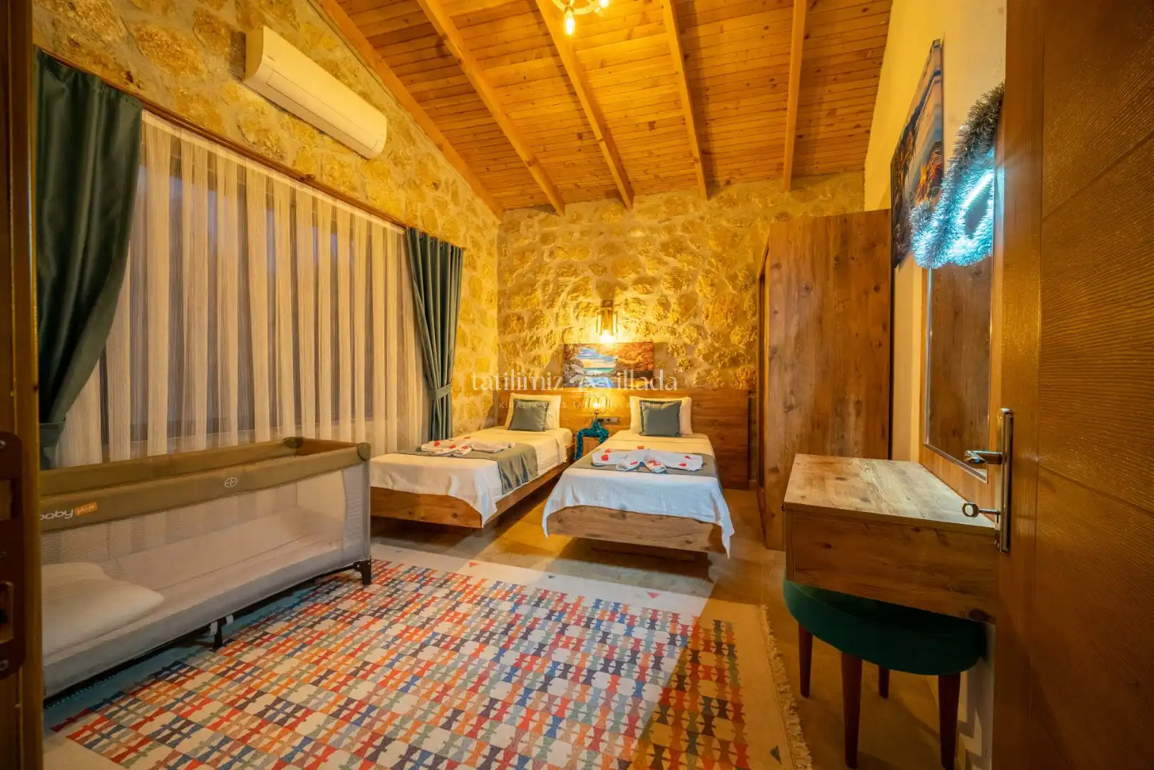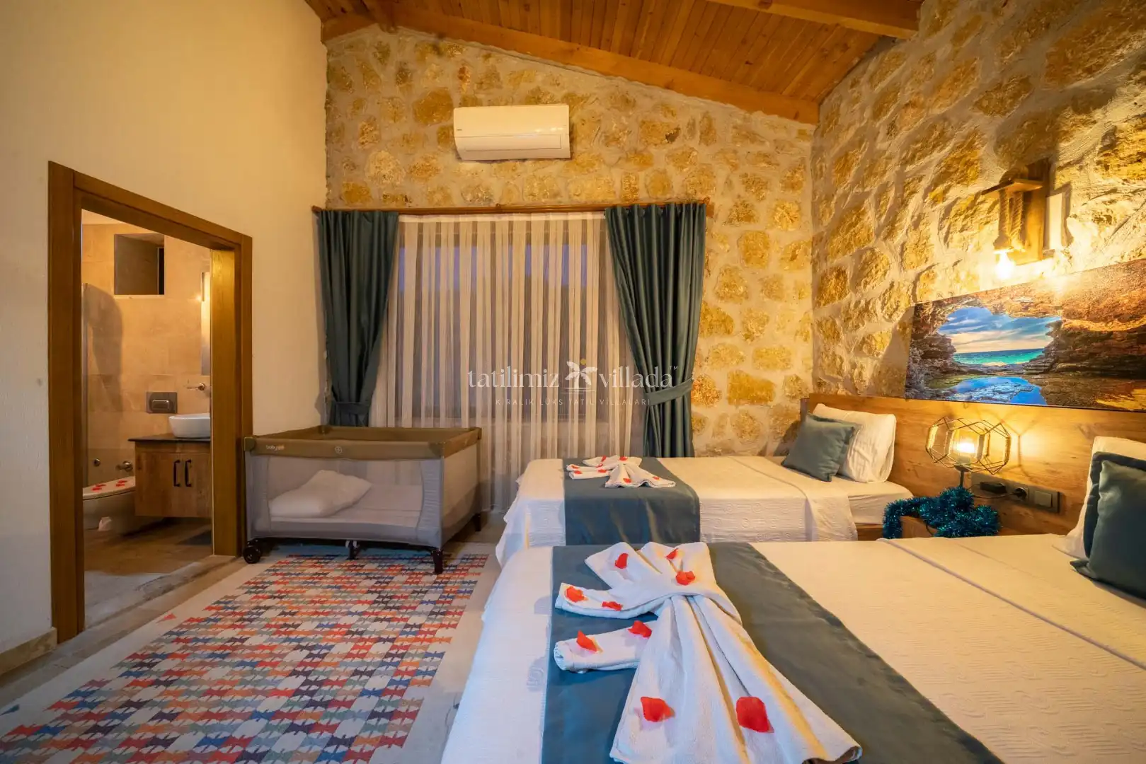 2 yatak odasına sahip olan villamız, 4 kişilik konaklama kapasitesi ile balayı çiftleri ve çekirdek aileler için oldukça uygundur. Şık ve konforlu bir şekilde dekore edilen iç mekânı, ferah yaşam alanları ve kullanışlı yapısıyla tatiliniz boyunca ihtiyacınız olan tüm detayları bir arada sunmaktadır.