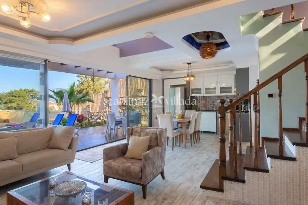 Modern ve şık bir anlayışla tasarlanan iç mekânlar; geniş oturma alanları ve ferah odalarıyla tatil boyunca rahat bir yaşam sunar. Havuz kenarı ve bahçede yer alan alanlar, günün her saatinde keyifli vakit geçirmek için uygundur.