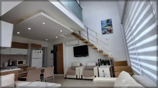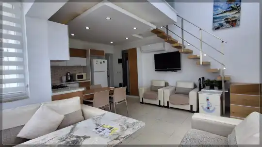 Modern tasarıma sahip 1+1 apartımızda ihtiyacınız olan temel donanımlar yer almakta olup, rahat ve huzurlu bir konaklama için özenle hazırlanmıştır. Merkezi konumu sayesinde hem eğlenceye hem de günlük ihtiyaçlarınıza kolayca erişebilir, aynı zamanda ortak havuzun keyfini çıkarabilirsiniz.