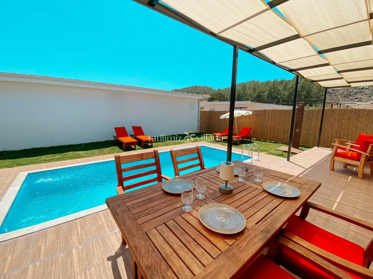 Dış mekanlarda da sizleri unutulmaz anlar bekliyor. Korunaklı bahçeler ve özel yüzme havuzları ile tamamen yalnız kalacak, dış dünyadan uzaklaşarak huzur içinde bir tatil geçirebileceksiniz. Gölgelikli alanlarda romantik akşam yemeklerinizi yiyebilir, güneşin batışını izlerken sakinleşebilirsiniz. Her villada özel otopark alanı sunulmuş, tatiliniz boyunca rahatça aracınızı park edebilir ve dışarıda vakit geçirme ihtiyacı duymadan villa içinde kendinizi tamamen rahat hissedebilirsiniz.