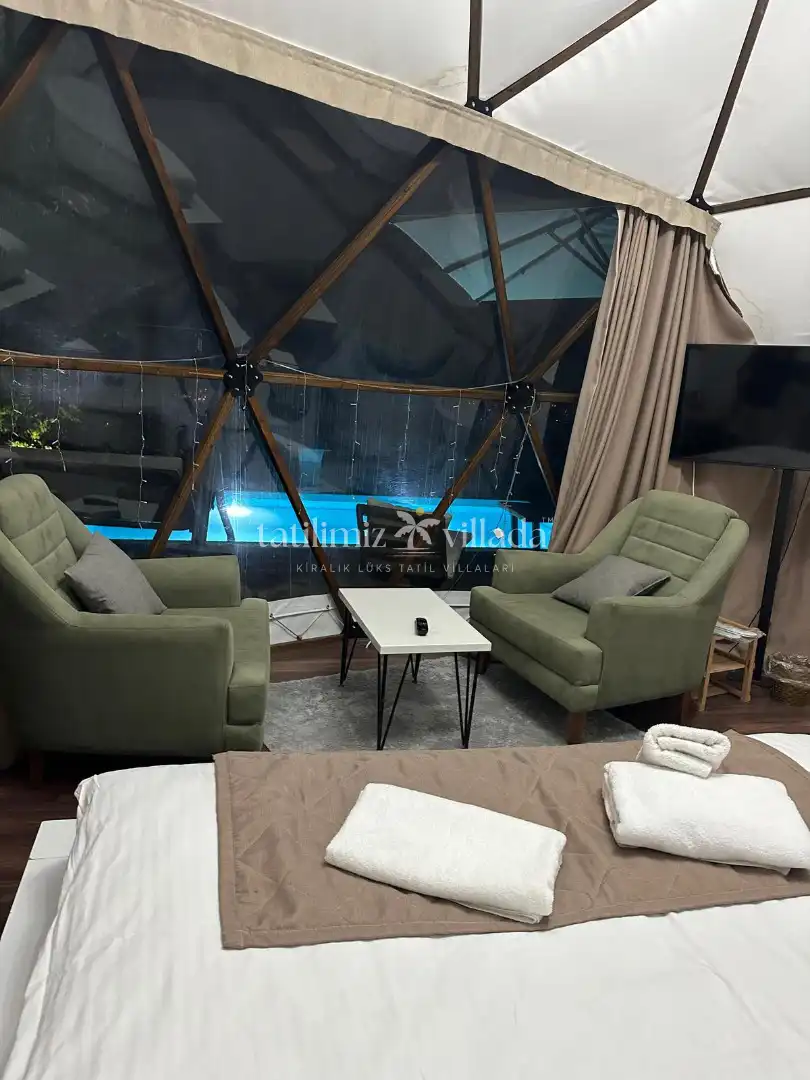 Phalesia Sapanca Bungalow’un en dikkat çeken özelliklerinden biri de ısıtmalı, tamamen korunaklı ve etrafı kapalı havuzlarıdır. Böylece hem yaz hem de kış aylarında havuz keyfi yapılabilmekte, mahremiyet arayan misafirler için de güvenli ve konforlu bir ortam sağlanmaktadır. Havuz keyfini daha da özel hale getirmek için kahvaltı hizmeti de dahil edilmiştir. Ayrıca üçüncü kişi konaklamalarında ekstra 1000 TL ücret alınmaktadır.