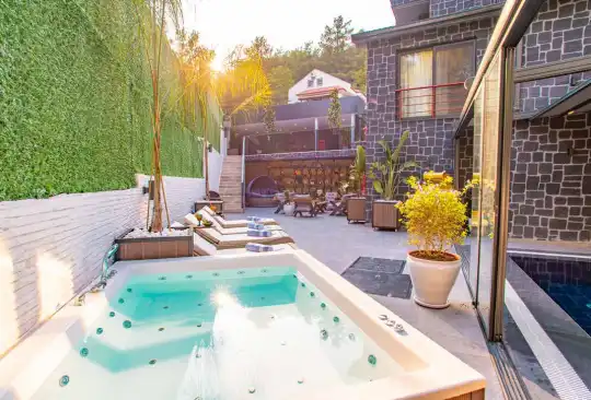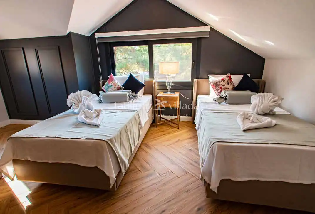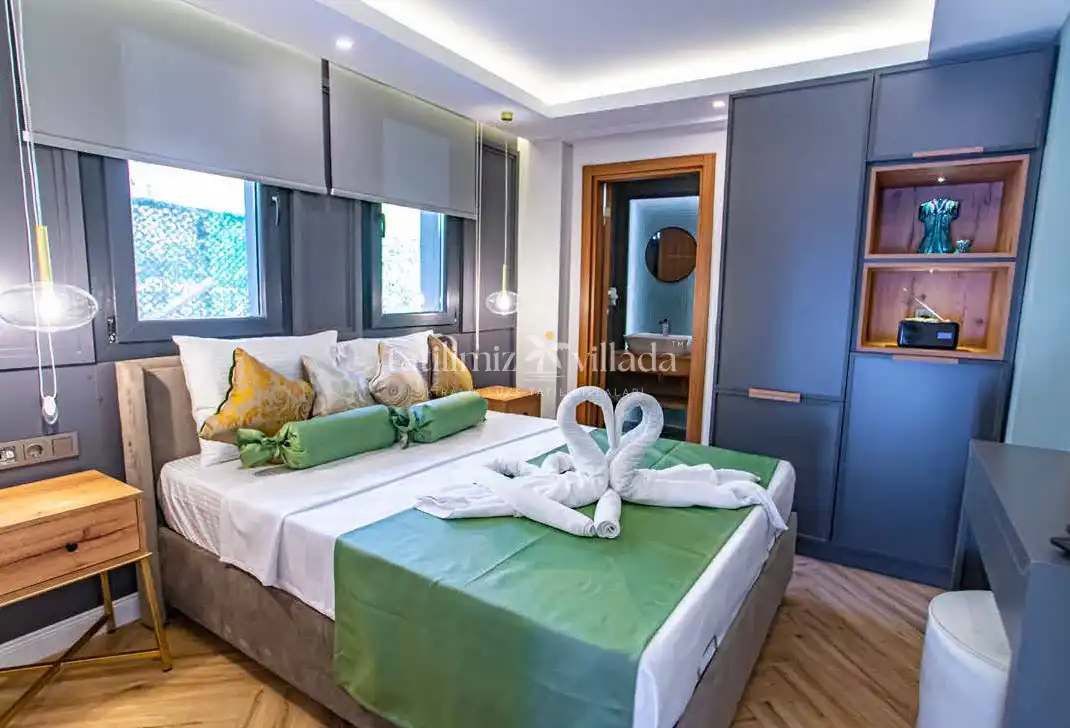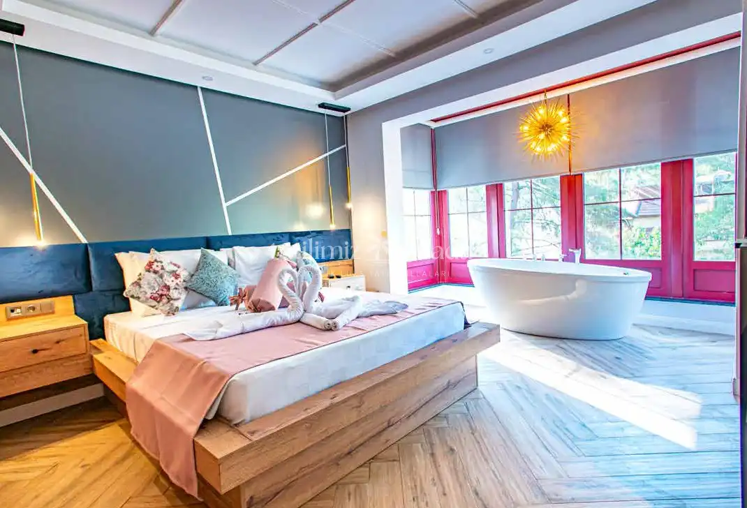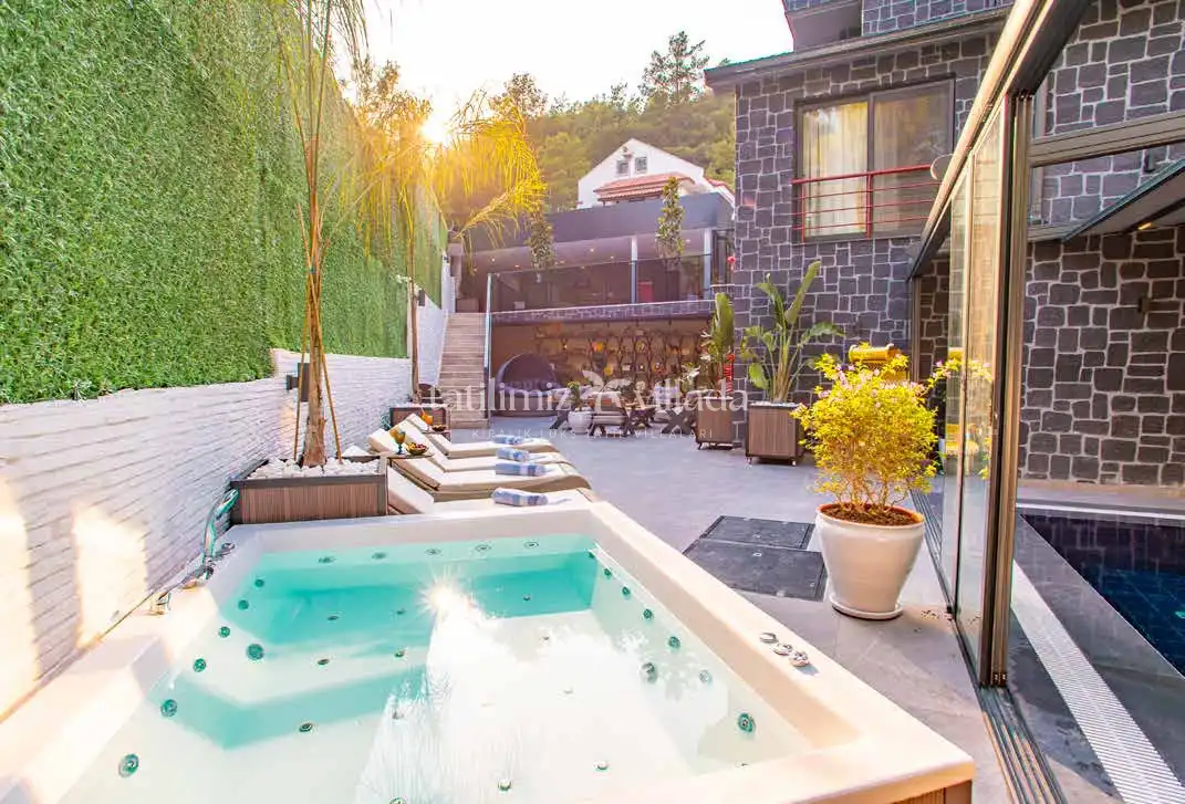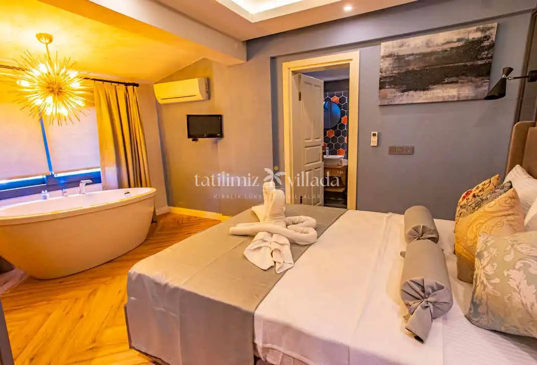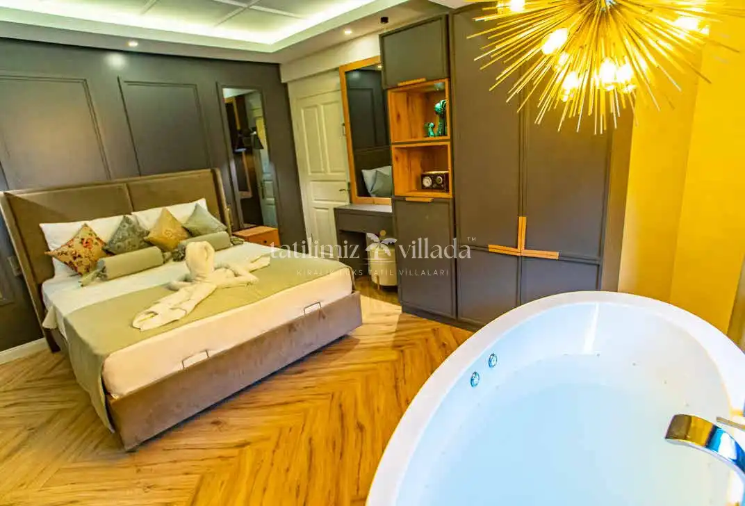 Villanın iç tasarımı konfor ve lüks detaylar düşünülerek hazırlanmıştır. Odaların büyük bir bölümünde özel jakuzi bulunması, hem tatilciler hem de yatırım düşünenler için villayı çok daha cazip kılmaktadır. Özellikle kalabalık ailelerde herkesin kendine ait alan bulabilmesi büyük bir avantajdır. Villada yer alan özel sauna, günün yorgunluğunu atmak ve dört mevsim keyifli vakit geçirmek isteyenler için ekstra bir ayrıcalık sunar.