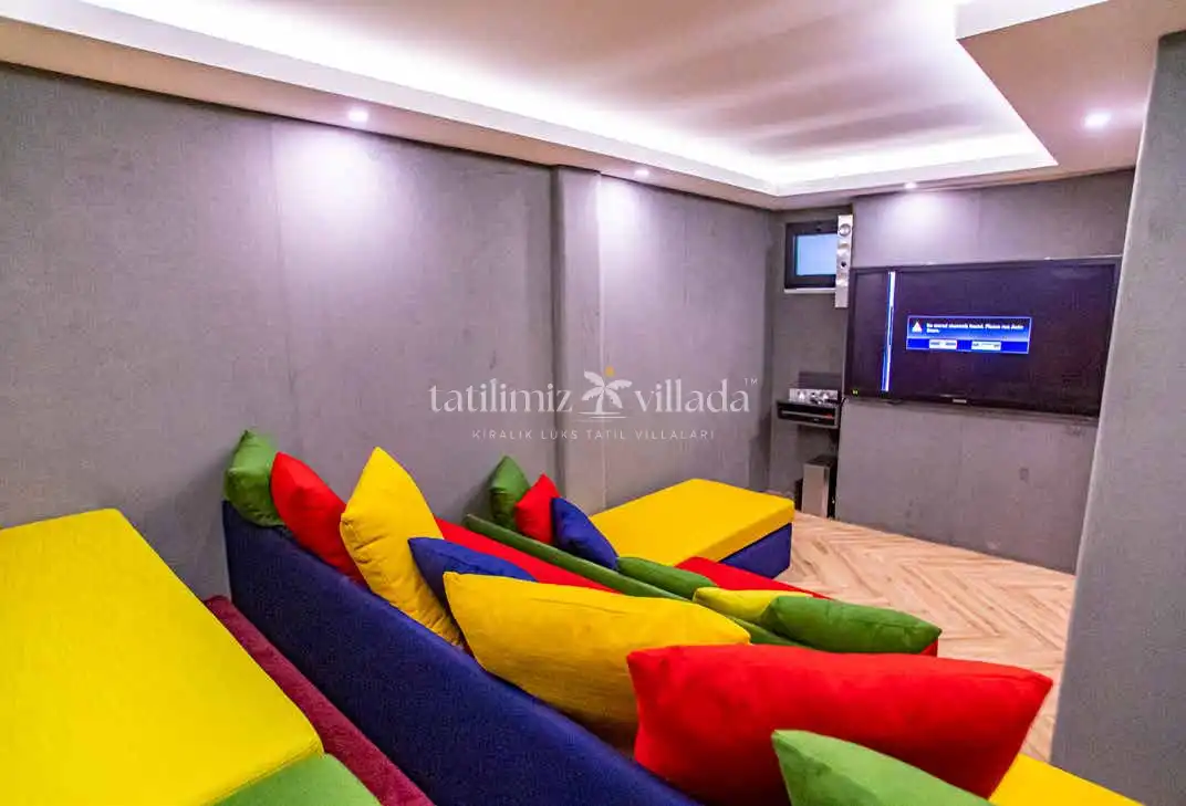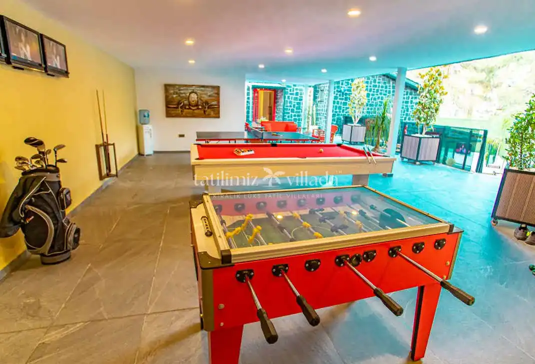 Villa A Plus’ın en dikkat çekici özelliklerinden biri ise eğlence alanlarıdır. Özel sinema salonu, langırt ve bilardo masası sayesinde villa içinde geçirilen zaman adeta bir tatil kompleksini aratmaz. Çocuklu aileler, arkadaş grupları ve özel organizasyonlar için oldukça ideal bir yapıya sahiptir. Bu özellikler villayı sadece konaklama değil, aynı zamanda keyifli bir yaşam alanı haline getirir.
