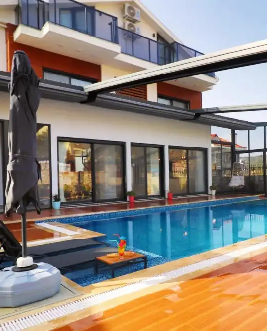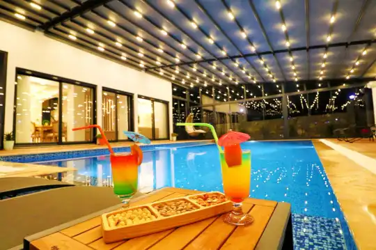Villa Adela, misafirlerinin konforu için özenle tasarlanmış, modern ve zarif bir yapıya sahiptir. Villamızda 4 yatak odası bulunmakta olup, her odada ebeveyn banyosu yer almaktadır. Ayrıca yatak odalarından birinde jakuzi bulunmaktadır ve bu özellik, misafirlerimize tatilleri sırasında ekstra bir rahatlık sunmaktadır. Villamız, 8 kişilik konaklama kapasitesine sahip olup, geniş aileler ve arkadaş grupları için ideal bir seçenektir. Villanın en dikkat çekici özelliklerinden biri, büyük bir yüzme havuzuna sahip olmasıdır. İsteğe bağlı olarak üstü ve yanları kapanabilen ve ısıtma özelliği bulunan bu havuz, hem yaz hem de kış aylarında kullanılabilir. Özellikle serin kış akşamlarında sıcak suyun keyfini çıkarabileceğiniz bu havuz, dört mevsim tatil imkanı sunmaktadır. Bunun yanı sıra, açık alan oturma grupları, salıncak ve langırt gibi eğlence alanları da villamızda mevcuttur. Çocuklar ve yetişkinler için tasarlanmış bu alanlar, keyifli ve unutulmaz bir tatil geçirmenizi sağlayacaktır.