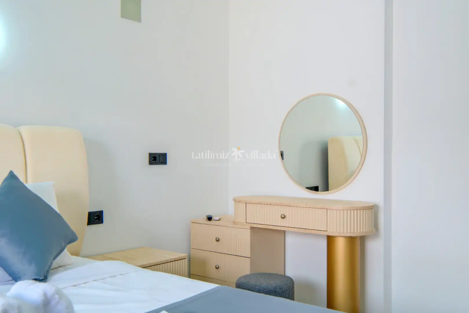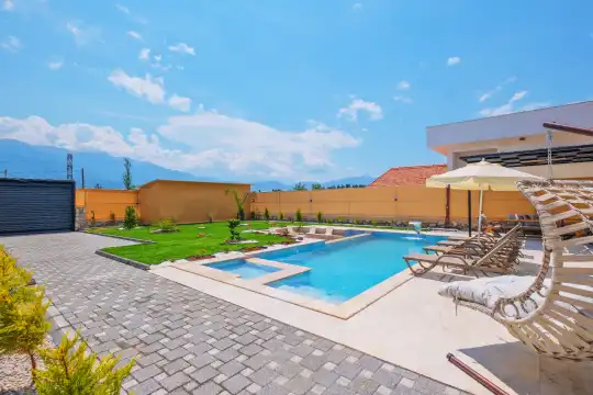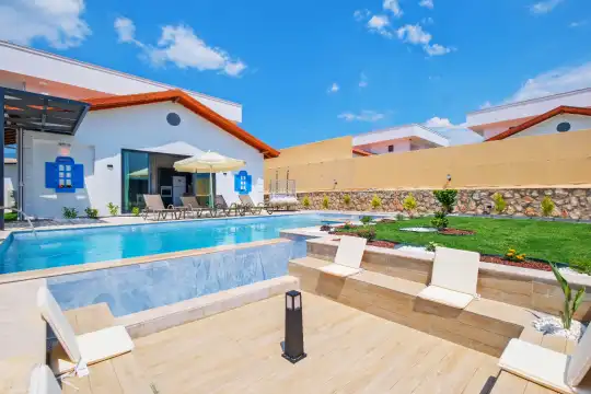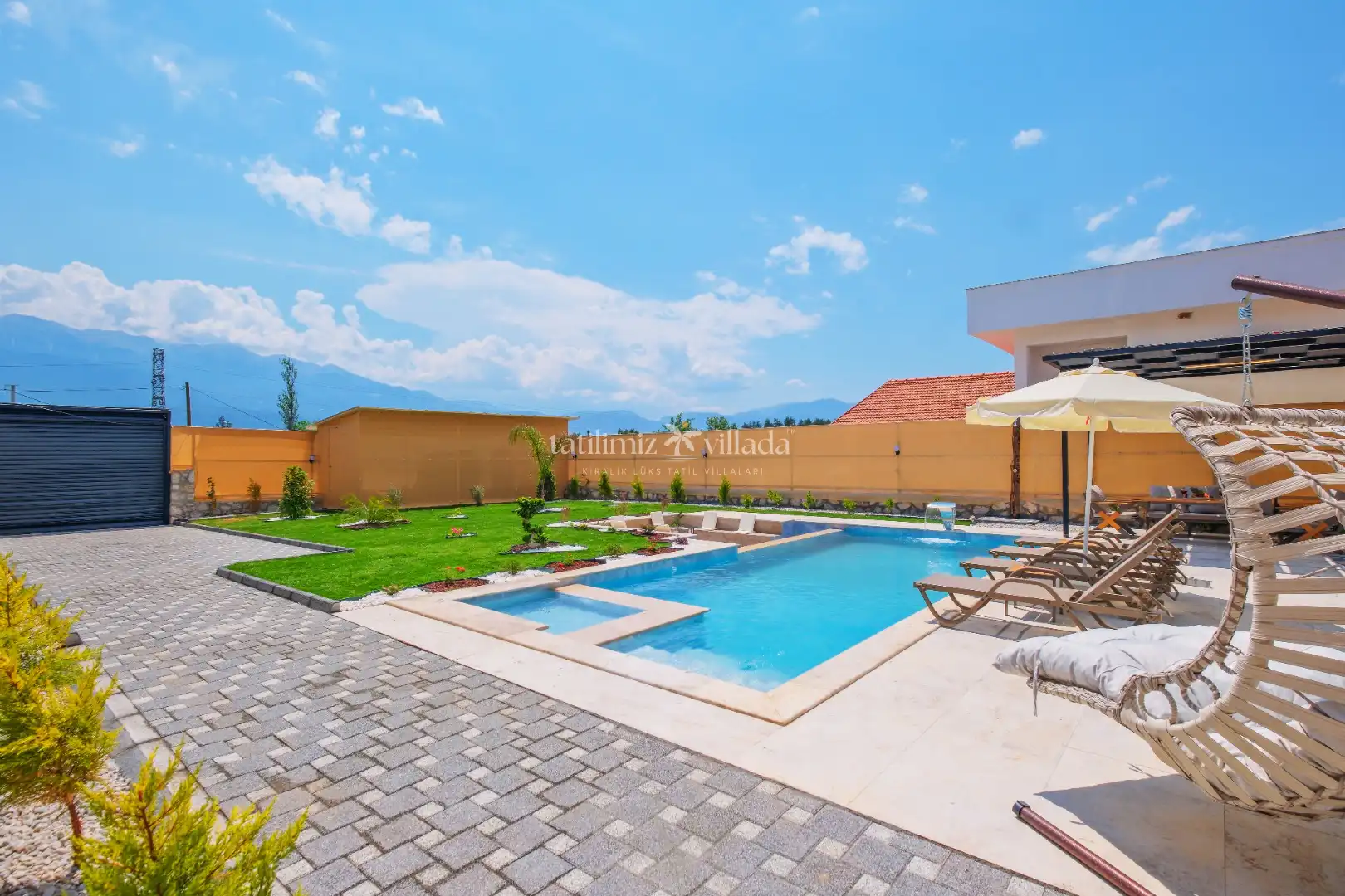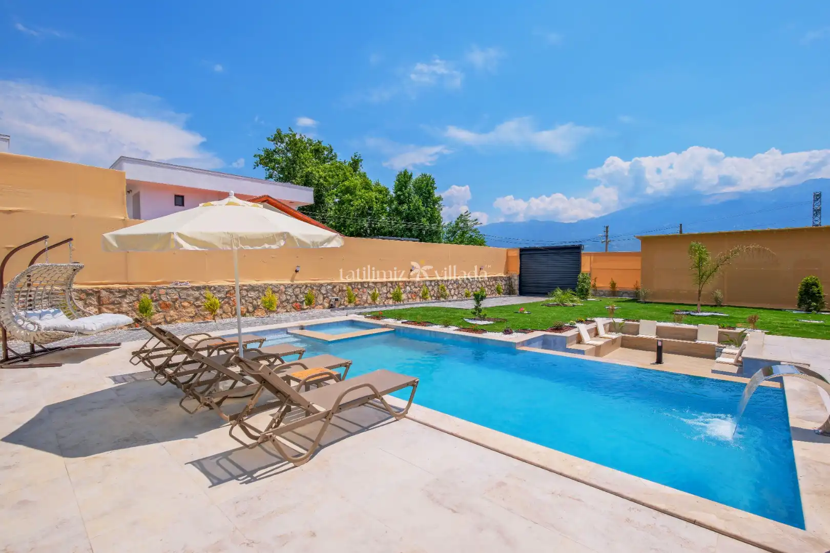 Villamızın her köşesi, misafirlerin konforunu ön planda tutacak şekilde özenle dizayn edilmiştir. Geniş bahçe alanı, özel yüzme havuzu ve rahat oturma grupları ile dış mekânda keyifli vakit geçirebilir, sevdiklerinizle birlikte unutulmaz anlar yaşayabilirsiniz. Villanın içerisinde modern mobilyalar, tam donanımlı bir mutfak, ferah salon ve konforlu yatak odaları bulunmaktadır.