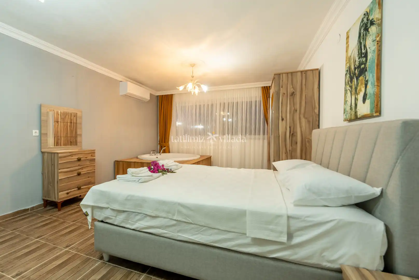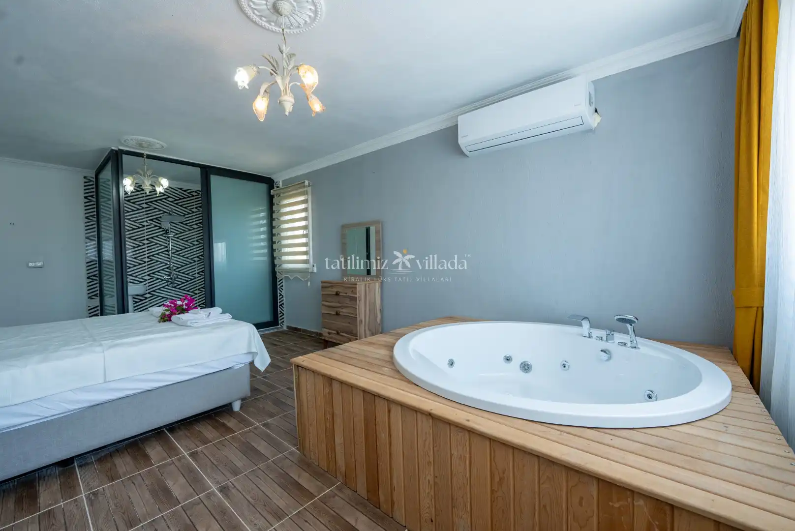 Villa içerisinde yer alan jakuzi ise tatilinize ekstra konfor katmaktadır. Günün yorgunluğunu atabileceğiniz bu özel alan, romantik ve dinlendirici anlar yaşamanıza olanak tanır. Modern ve konforlu yaşam alanları, şık dekorasyonu ve kullanışlı tasarımı sayesinde tatiliniz boyunca evinizin rahatlığını hissedersiniz.
