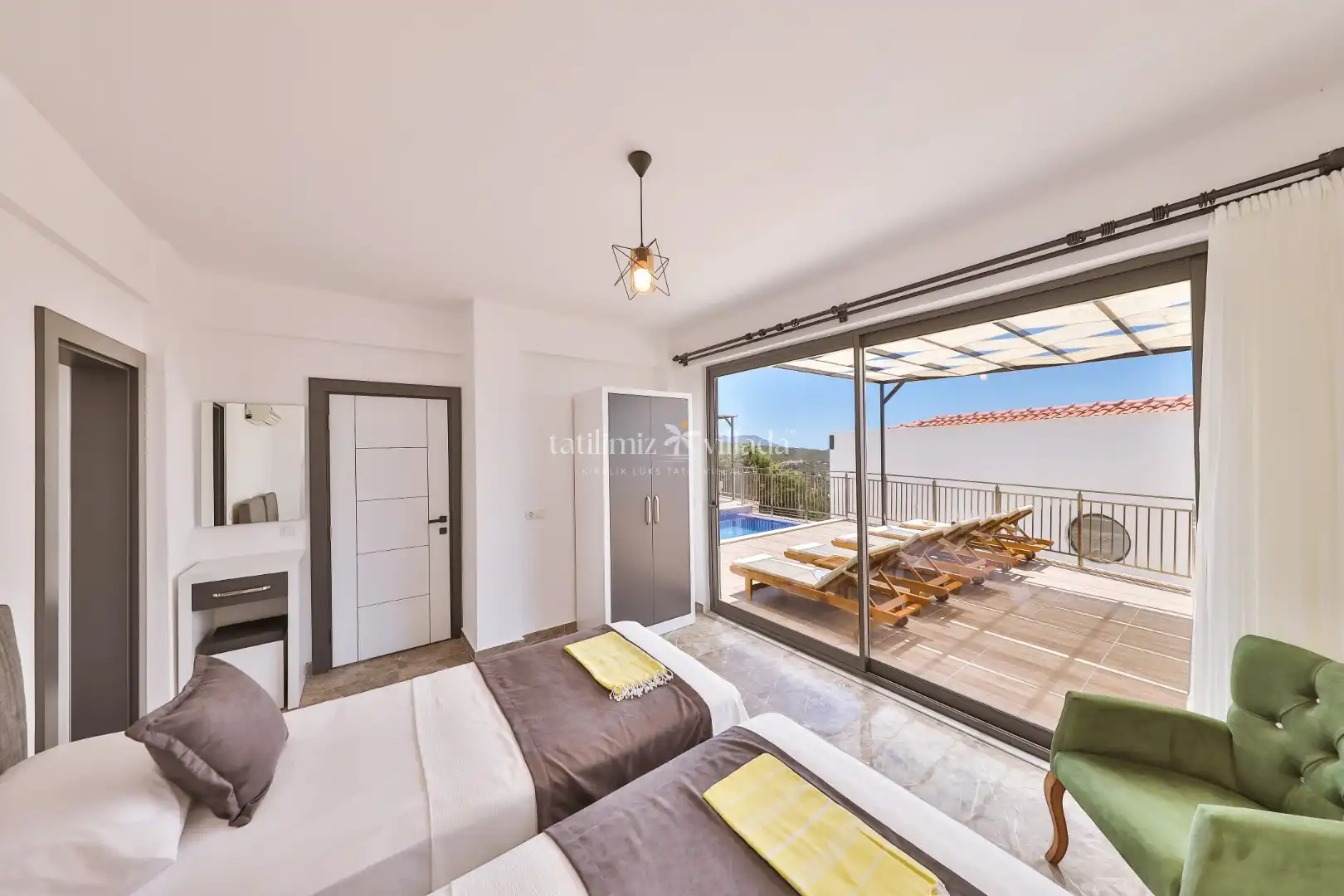 Villamızda üç yatak odası bulunmaktadır. İki yatak odası içerisinde çift kişilik yatak, üçüncü yatak odasında iki tek kişilik yatak tüm odalarda banyo ve klima bulunmaktadır. Üst yatak odalarından güneşin doğuşundan batışına 180 derece bir manzarada izleyebilirsiniz. Ortak alanda ise salon, mutfak, televizyon ve klima yer alır.
