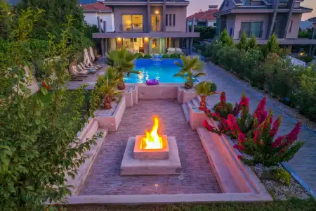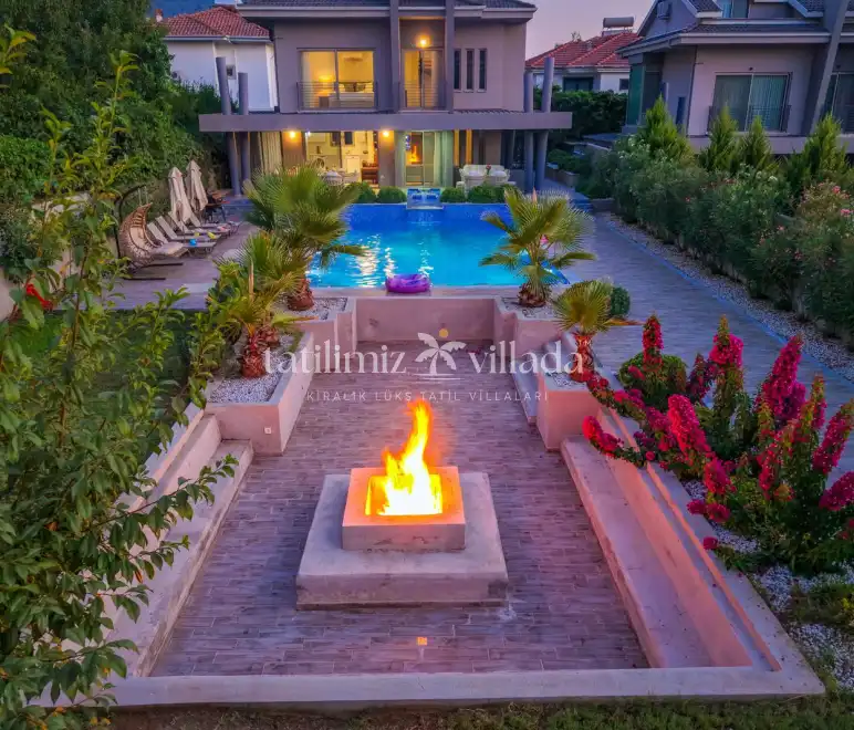 Geniş havuz terası ve müstakil bahçesi; şezlong, şemsiye, oturma alanı, yemek masası, ateş çukuru ve barbekü alanı ile tatilinizi hem eğlenceli hem de rahat geçirmenize imkân tanır. Doğa manzarası eşliğinde güne başlayabilir, havuzun ve bahçenin keyfini çıkarabilirsiniz.