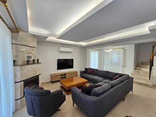 Villanın iç tasarımında modern çizgiler ön planda tutulmuş olup; geniş ve konforlu yatak odaları, ferah salon alanı ve tam donanımlı mutfağı ile misafirlerin tüm ihtiyaçları düşünülmüştür. Aile bireylerinin bir arada keyifle vakit geçirebileceği bu alanlar, tatilinizi hem rahat hem de keyifli hale getirir.