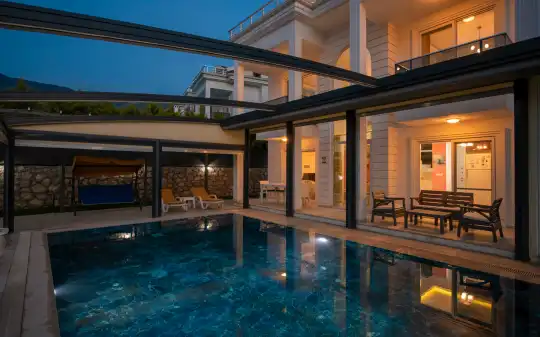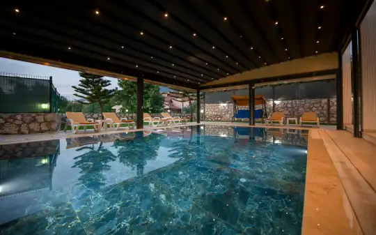 Villa Arda’nın en dikkat çekici özelliklerinden biri, etrafı ve üstü tamamen kapanabilen özel yüzme havuzudur. Bu sayede dört mevsim kullanıma uygun olan havuz, misafirlere daha güvenli ve konforlu bir yüzme deneyimi sunmaktadır. Havuz başında güneşlenme imkânı, dinlenme alanları ve keyifli sohbetler için düzenlenmiş bir çardak da villanın ayrıcalıkları arasında yer almaktadır.