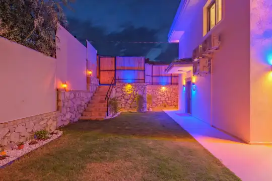 Villanın dış alanında ise özel yüzme havuzu, şezlonglar, yemek masası ve barbekü alanı bulunmaktadır. Havuz ve bahçe bölümü dışarıdan görünmeyecek şekilde korunaklı olarak tasarlanmıştır. Bu sayede muhafazakar hassasiyete sahip misafirler gönül rahatlığıyla tatilin keyfini çıkarabilir. Bahçede yer alan oturma alanı ise doğa manzarası eşliğinde dinlenmek için ideal bir ortam sunar.