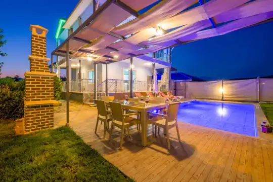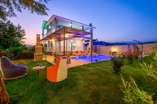 Villamızın içerisinde 4 yatak odası ve geniş bir salon bulunmakta olup, toplamda 8 kişiye kadar konaklama imkânı sunmaktadır. Modern ve kullanışlı mutfağı, ferah oturma alanları ve tüm odalarda bulunan konforlu yatak düzeni ile misafirlerine ev rahatlığında bir tatil imkanı sağlar. Villamızda yer alan özel yüzme havuzu, gün boyu serinlemeniz ve keyifli vakit geçirmeniz için hizmetinizdedir.