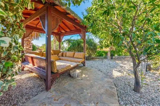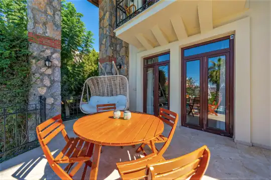 Villa Aychin’in dış alanında özel yüzme havuzu, güneşlenme alanları, bahçe mobilyaları ve barbekü köşesi yer almaktadır. Geniş bahçesi, doğayla iç içe bir tatil geçirmek isteyenler için keyifli bir alan sunar. Taş duvarlarla çevrili olması sayesinde villa, gözlerden uzak, tamamen size ait bir alan sağlar.