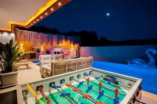 Dış mekânda, hem yetişkinler hem de çocuklar için özel olarak tasarlanmış yüzme havuzları, güneşlenme alanları, oturma grupları ve barbekü köşesi bulunmaktadır. Korunaklı ve geniş bahçe sayesinde mahremiyetiniz korunur; gün boyu dinlenmek ve sevdiklerinizle keyifli vakit geçirmek mümkün olur. Villa Azores’in kiralık villa özellikleri, misafirlerine modern konfor, güvenli ve huzurlu bir tatil imkânı sunmaktadır.