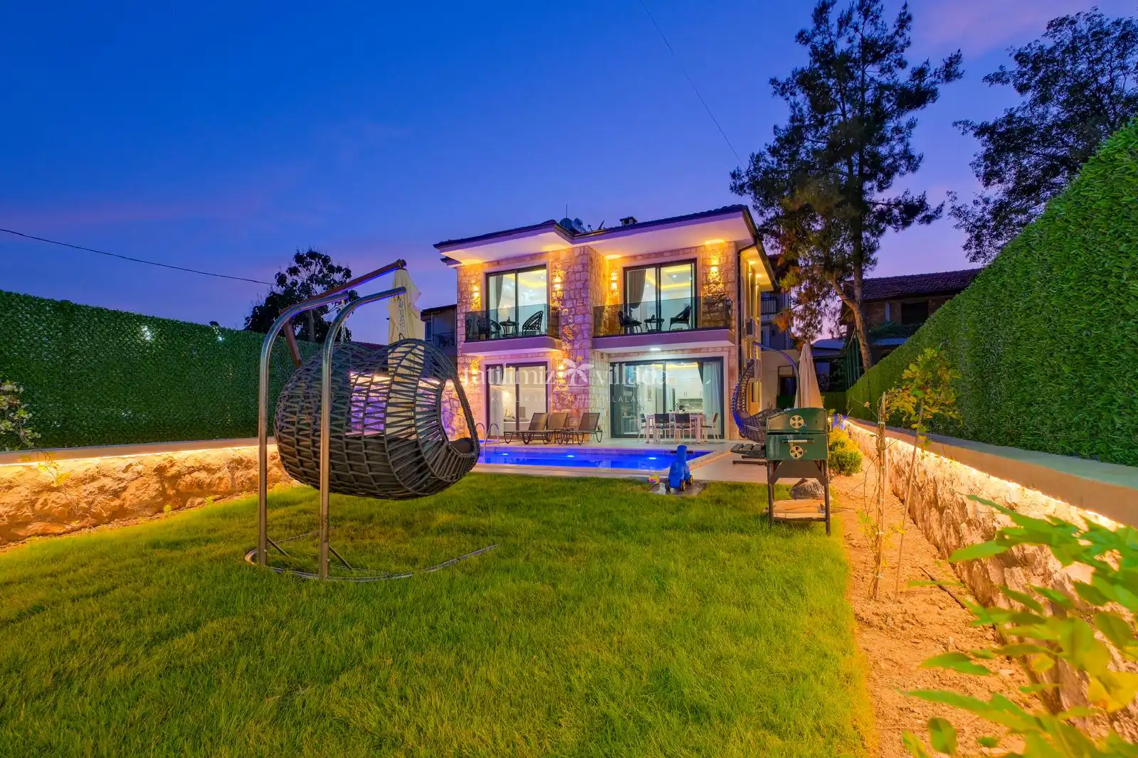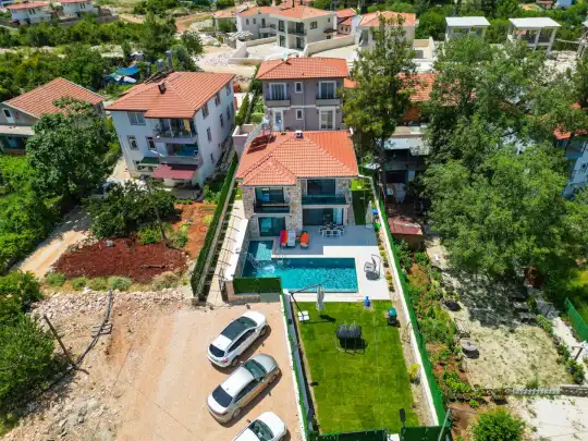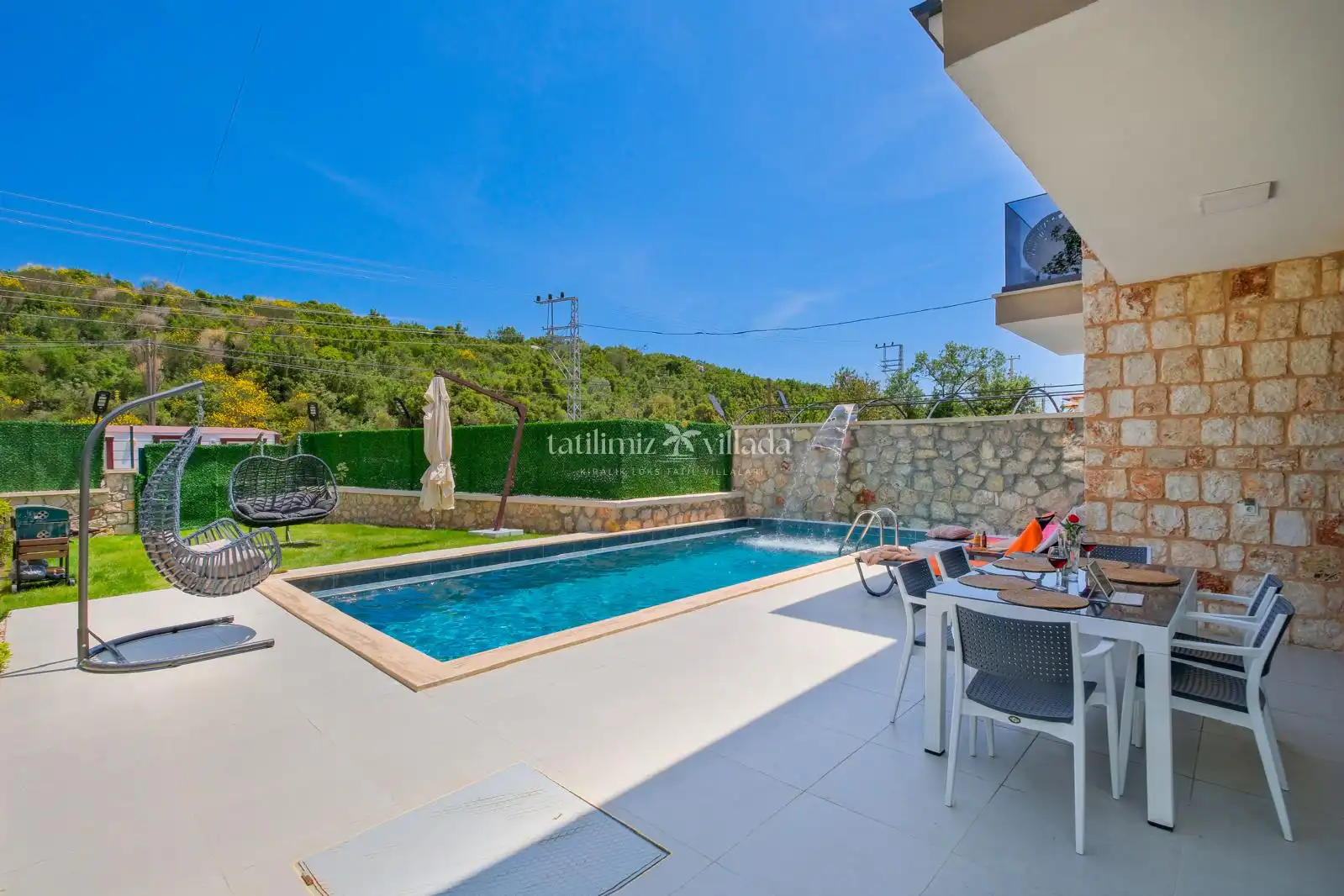 Villanın dış alanında 9x4 metre ölçülerinde özel yüzme havuzu ve ayrıca çocuk havuzu yer almaktadır. Havuz alanı tamamen korunaklı olup dışarıdan görünmemektedir. Taş duvarlarla çevrili geniş bahçe ve oturma alanları, doğayla iç içe huzurlu vakit geçirmek isteyen misafirler için tasarlanmıştır. Ayrıca özel otopark alanı mevcuttur. Villaya girişte 15 basamak bulunmaktadır.