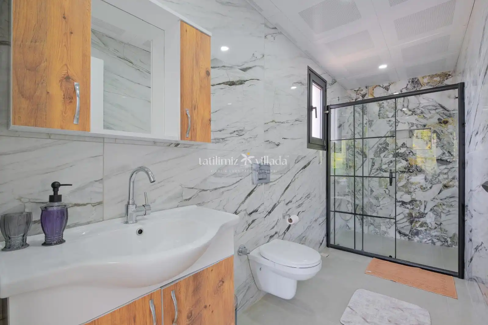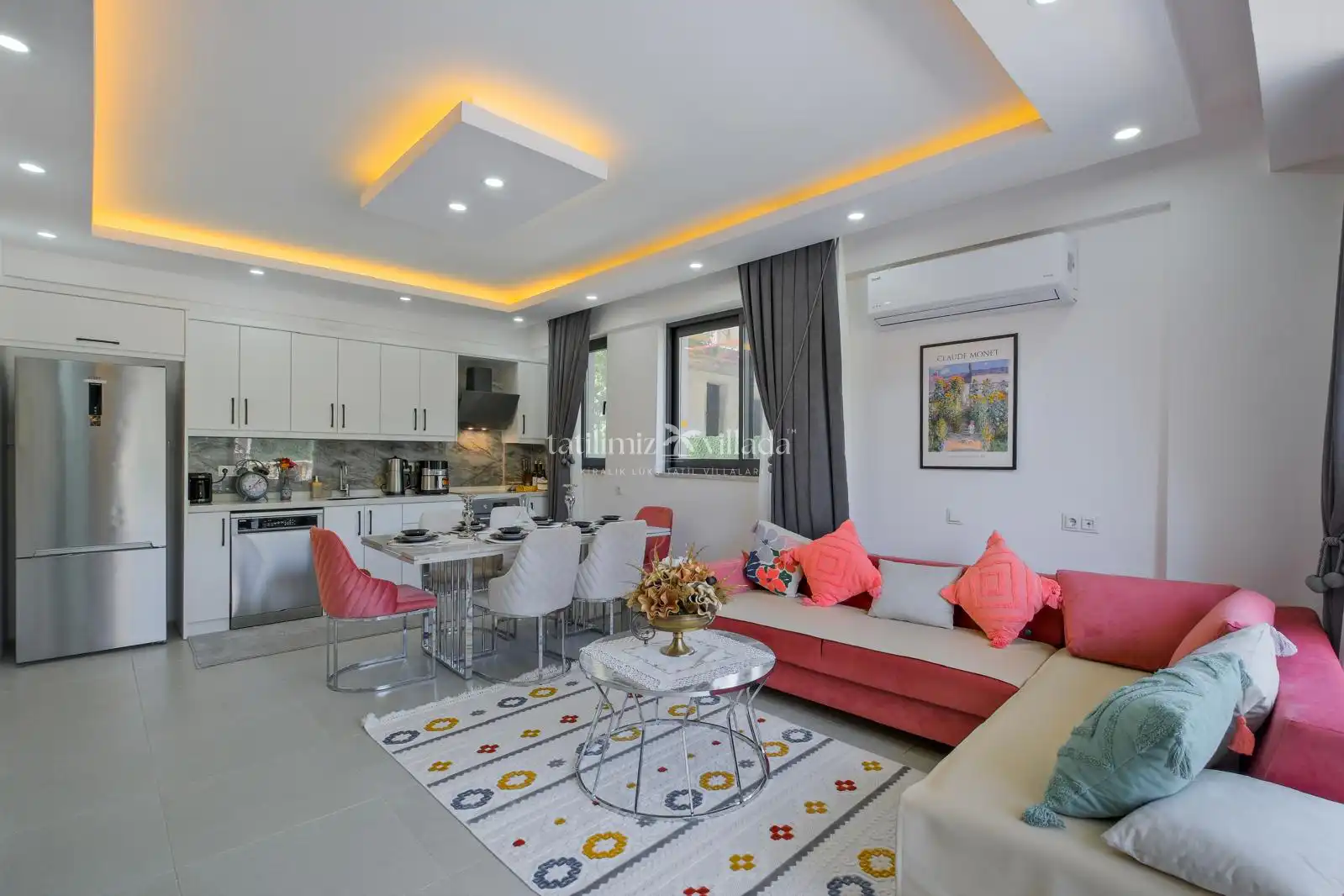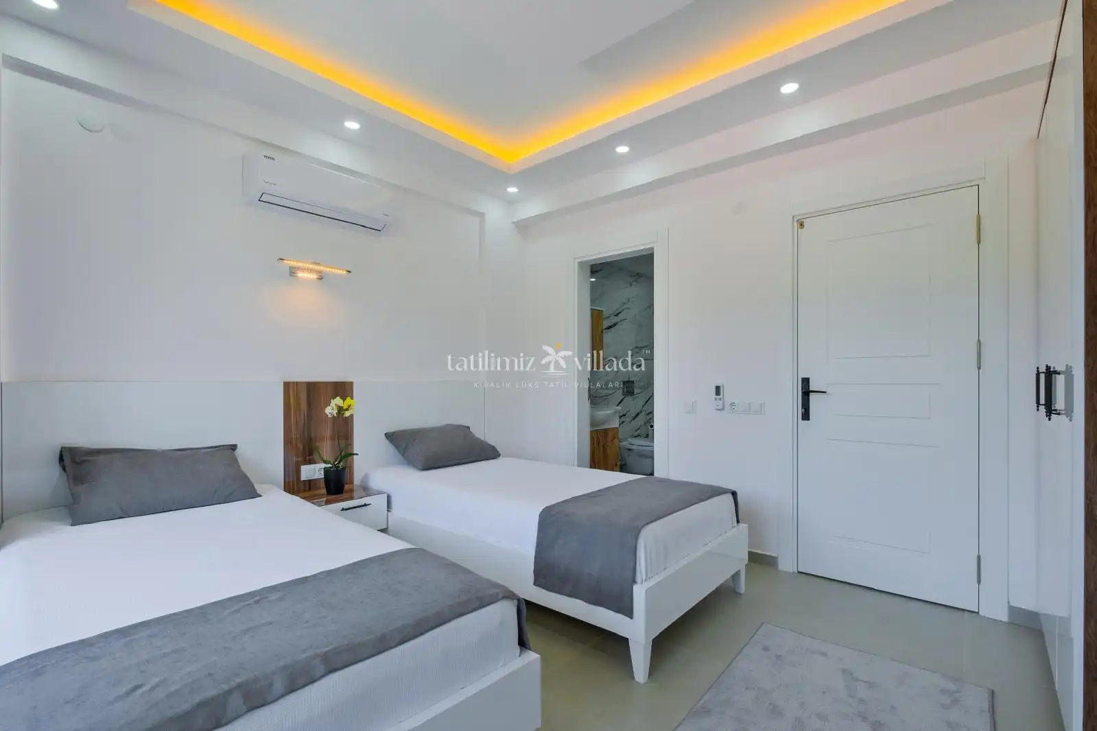 3 yatak odası ve 3 banyosu bulunan dubleks villamız, 6 kişilik konaklama kapasitesine sahiptir. Ferah 3+1 yaşam alanı sayesinde hem aileler hem de arkadaş grupları rahat bir tatil geçirebilir. Modern mobilyalarla dekore edilen iç mekânda 4 adet klima ve güneş enerjili sıcak su sistemi bulunmaktadır.
