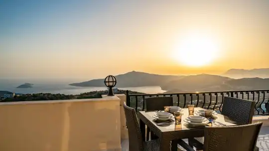 Kalkan Kördere mevkiinde bulunan villa, 3 yatak odasıyla 6 kişilik konaklama kapasitesi sunmaktadır. Doğa ve deniz manzarasına hakim, genişliği ile göz dolduran villa, kalabalık aile ve arkadaş grupları için uygundur.