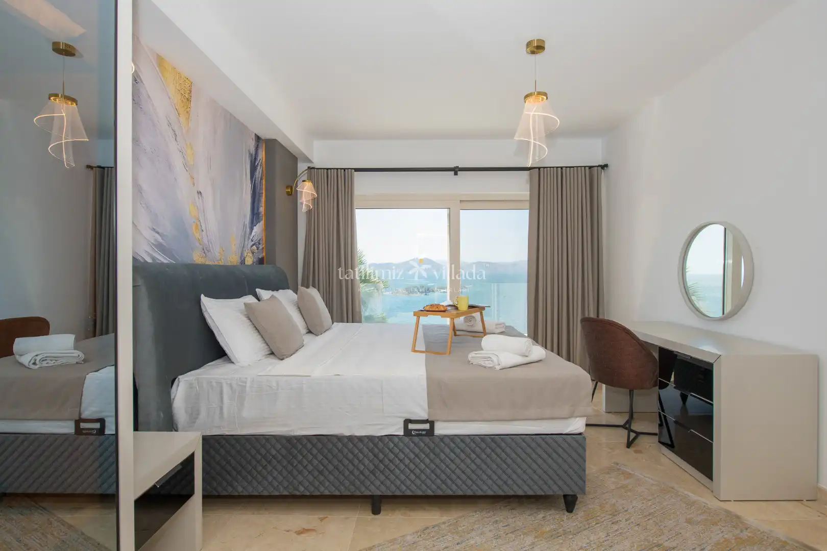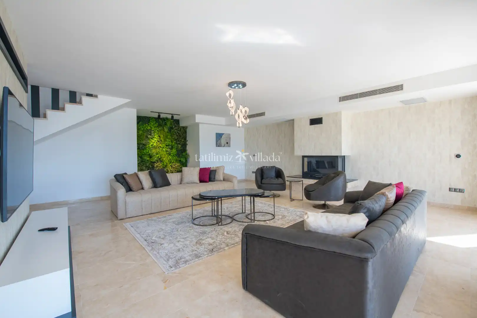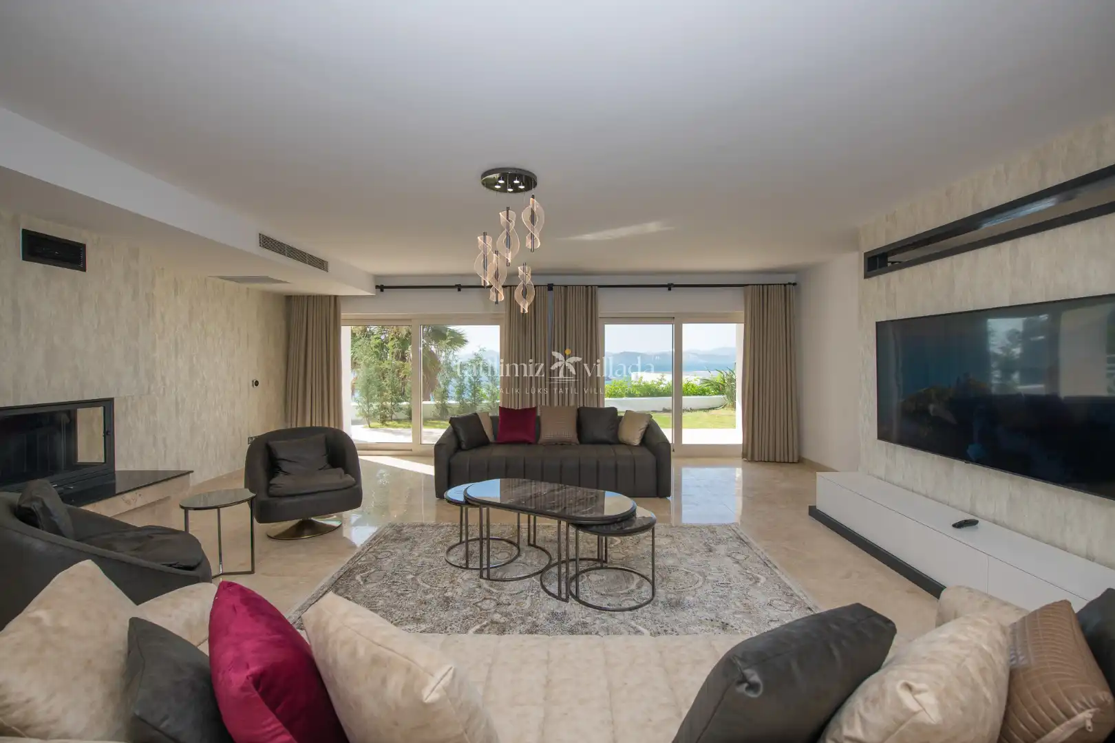 Villamızın her odasından kesintisiz deniz manzarası izlenebilirken, geniş cam yüzeyler sayesinde gün boyu doğal ışık iç mekânlara dolmaktadır. Birinci sınıf malzemelerle dekore edilen ferah yaşam alanları, modern ve sofistike bir tarzda tasarlanmıştır. Açık plan salon ve mutfak düzeni, kalabalık aileler ve arkadaş grupları için rahat bir kullanım sunar.