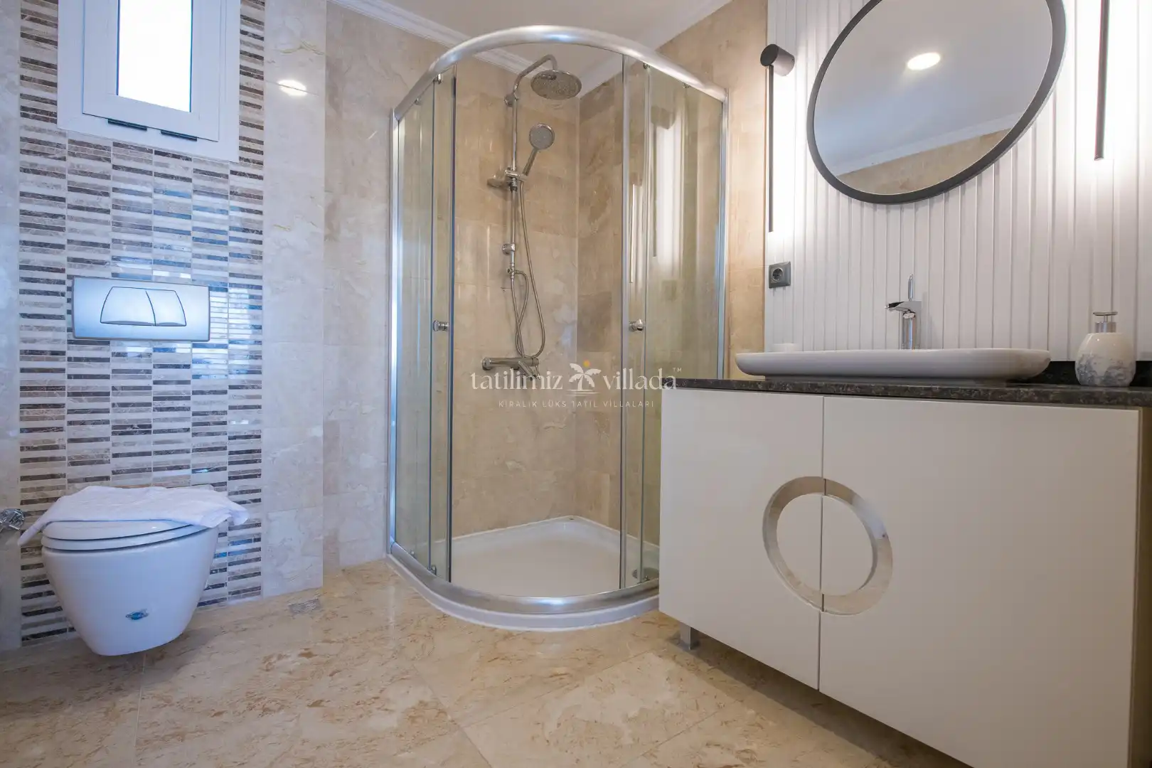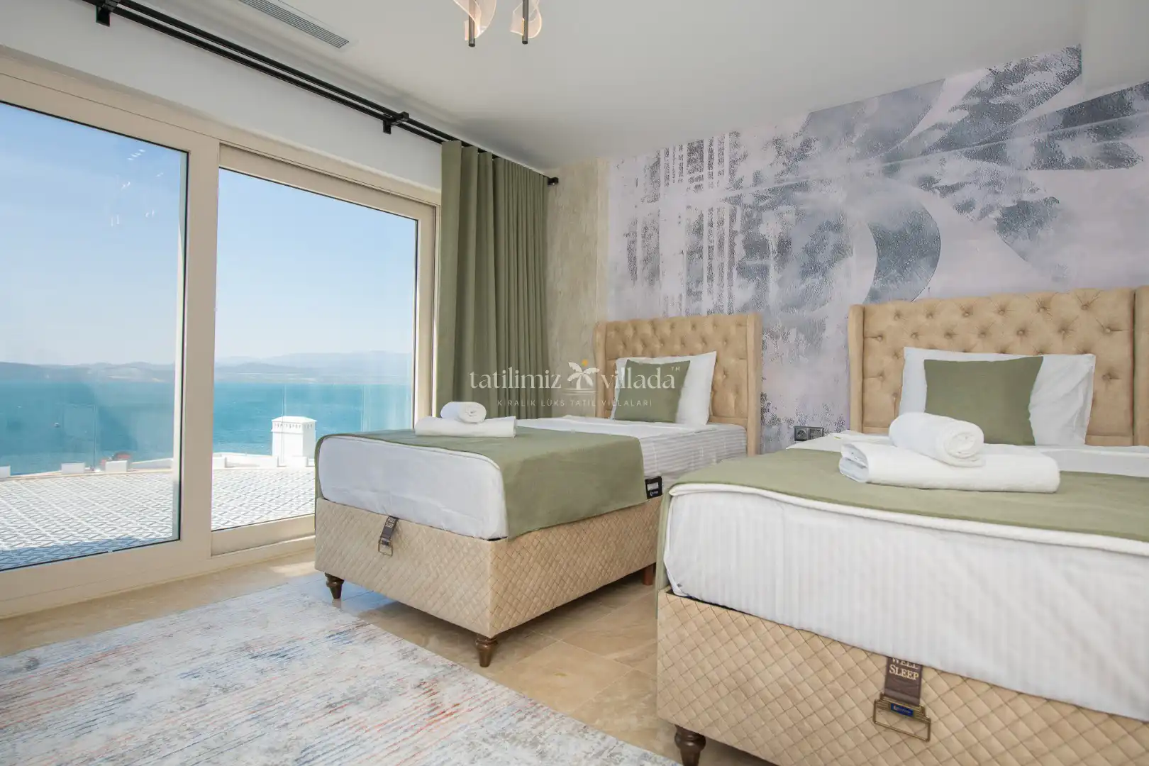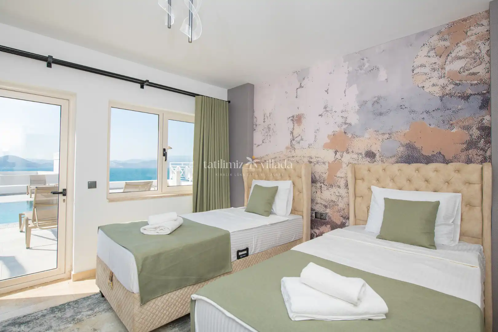 Villamızın her odasından kesintisiz deniz manzarası izlenebilirken, geniş cam yüzeyler sayesinde gün boyu doğal ışık iç mekânlara dolmaktadır. Birinci sınıf malzemelerle dekore edilen ferah yaşam alanları, modern ve sofistike bir tarzda tasarlanmıştır. Açık plan salon ve mutfak düzeni, kalabalık aileler ve arkadaş grupları için rahat bir kullanım sunar.