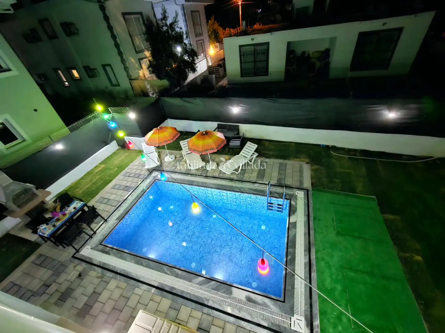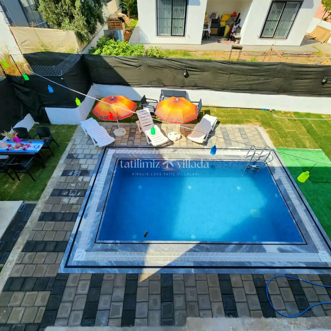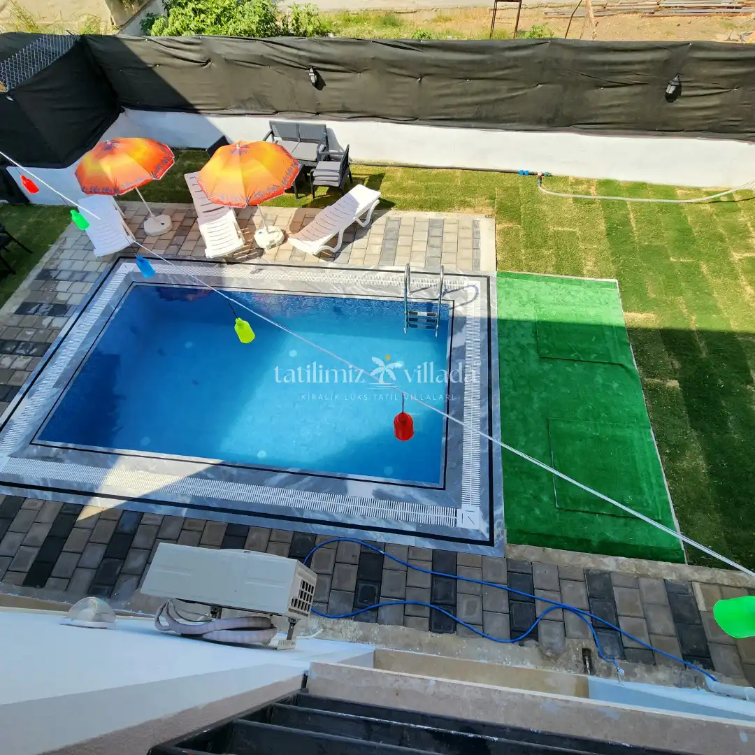 Villanın dış alanında özel yüzme havuzu, geniş bahçe ve barbekü alanı bulunur. Gün boyunca havuz keyfi yapabilir, sevdiklerinizle birlikte açık havada keyifli vakit geçirebilirsiniz. Havuz ölçüleri 3m x 5m ve 1,55m derinliğe sahiptir; güvenli ve rahat bir kullanım sağlar.