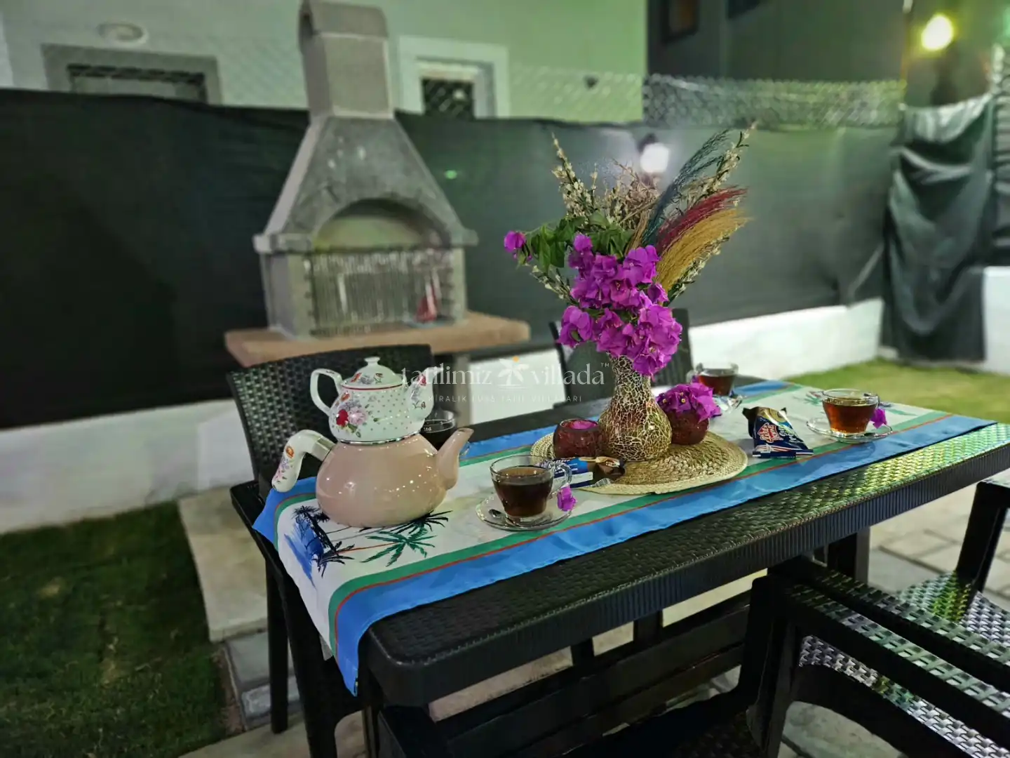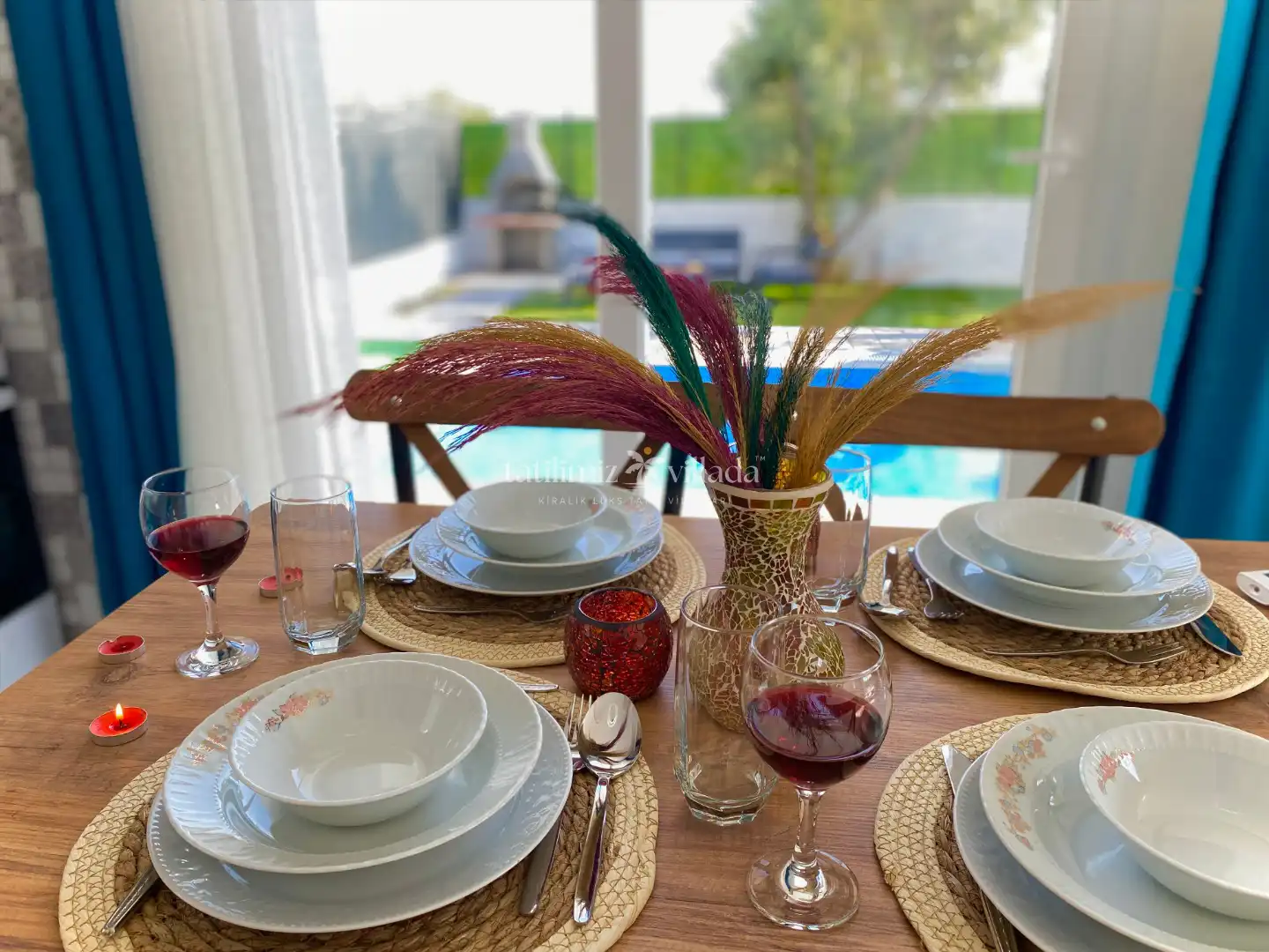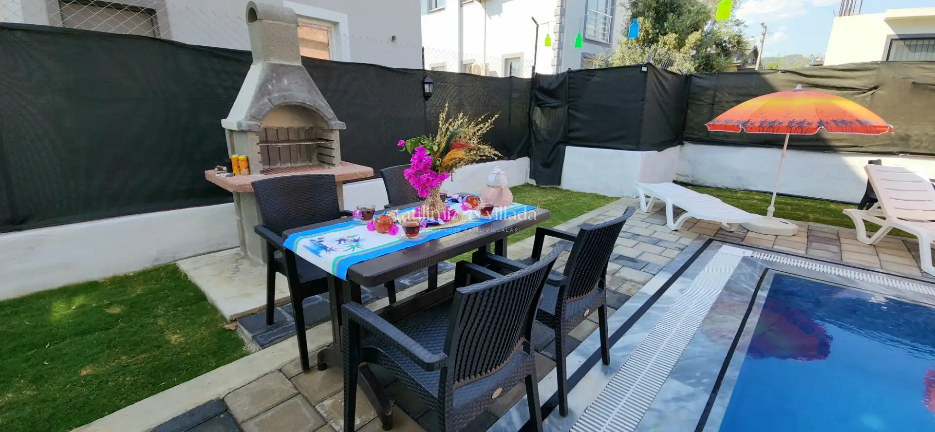 Villanın dış alanında özel yüzme havuzu, geniş bahçe ve barbekü alanı bulunur. Gün boyunca havuz keyfi yapabilir, sevdiklerinizle birlikte açık havada keyifli vakit geçirebilirsiniz. Havuz ölçüleri 3m x 5m ve 1,55m derinliğe sahiptir; güvenli ve rahat bir kullanım sağlar.