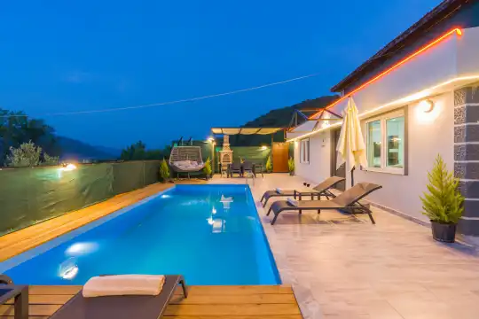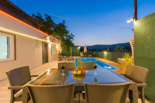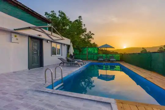 Villanın dış alanında özel yüzme havuzu, şezlonglar, yemek masası ve barbekü alanı gibi keyifli vakit geçirebileceğiniz imkanlar bulunmaktadır. Korunaklı havuz alanı sayesinde muhafazakar aileler için de uygun bir konaklama ortamı sunulmaktadır.