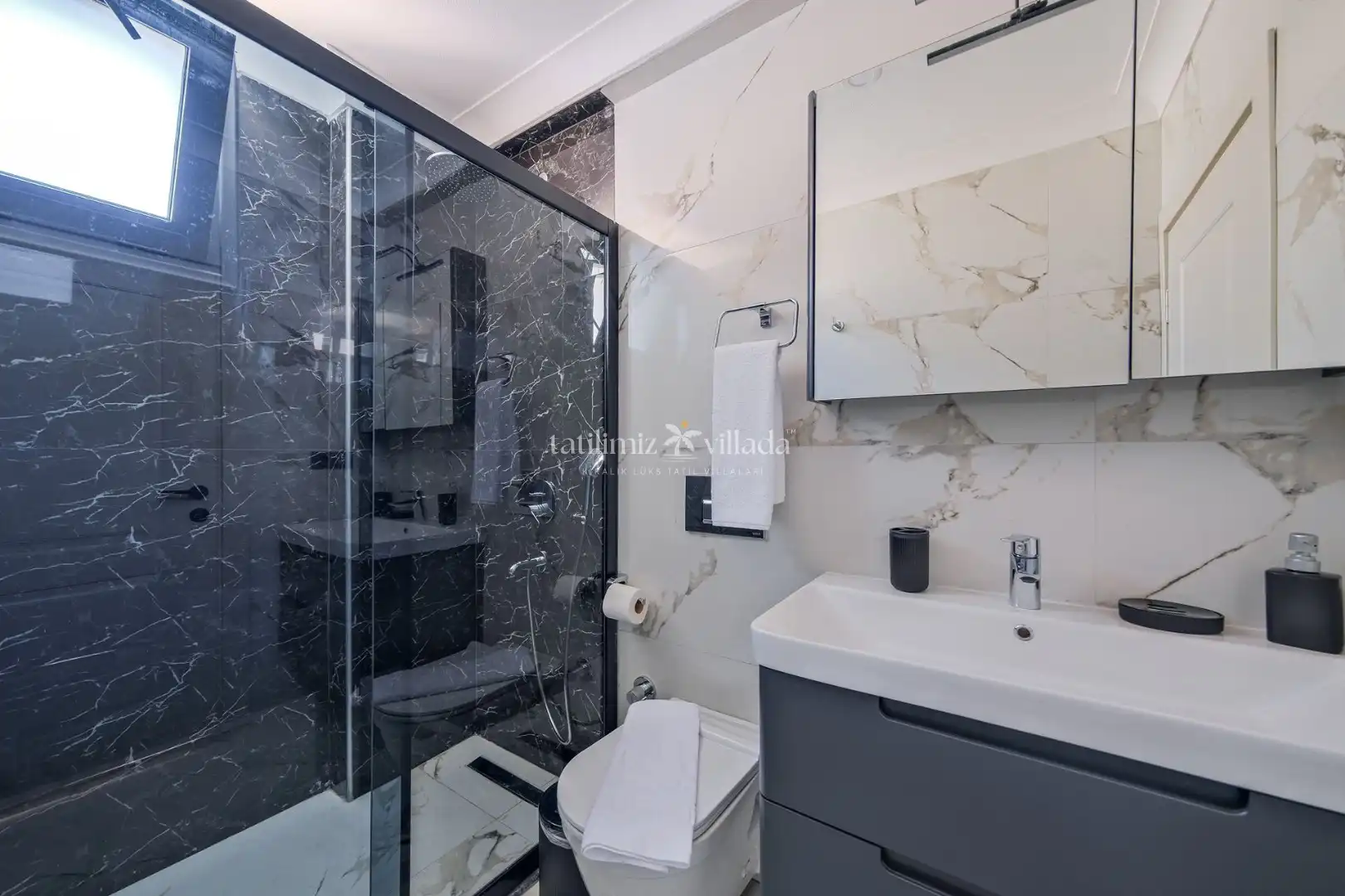 Villamızın tüm yatak odalarında ebeveyn banyosu bulunmakta olup misafirlerimizin konforu ve mahremiyeti ön planda tutulmuştur. Modern mimarisi, şık dekorasyonu ve geniş yaşam alanları ile ev rahatlığında bir tatil deneyimi sunar.