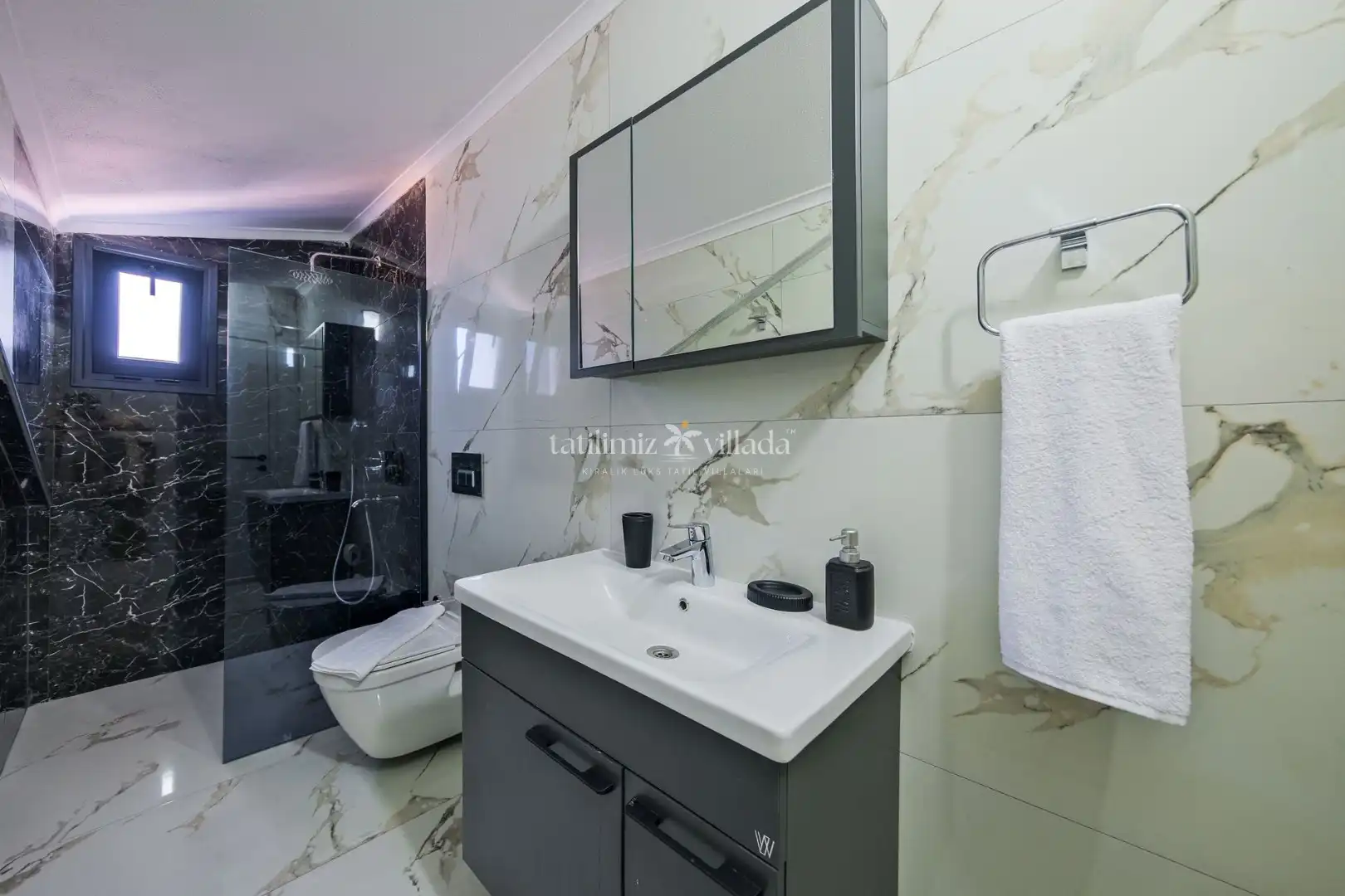Villamızın tüm yatak odalarında ebeveyn banyosu bulunmakta olup misafirlerimizin konforu ve mahremiyeti ön planda tutulmuştur. Modern mimarisi, şık dekorasyonu ve geniş yaşam alanları ile ev rahatlığında bir tatil deneyimi sunar.