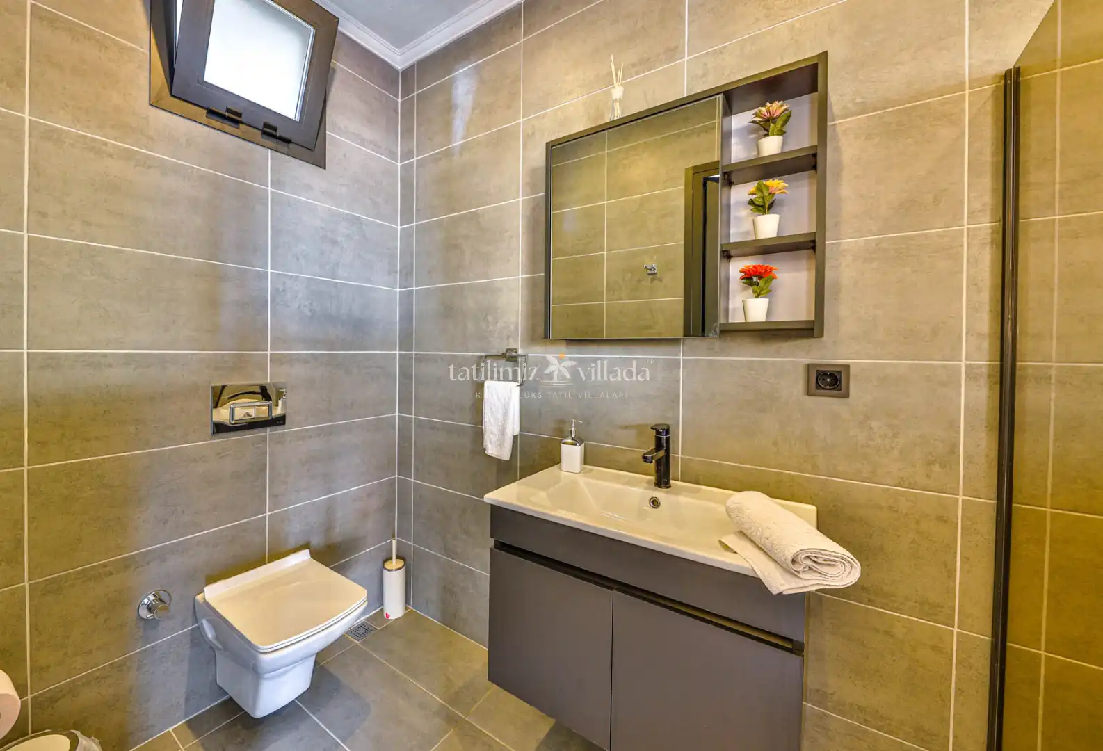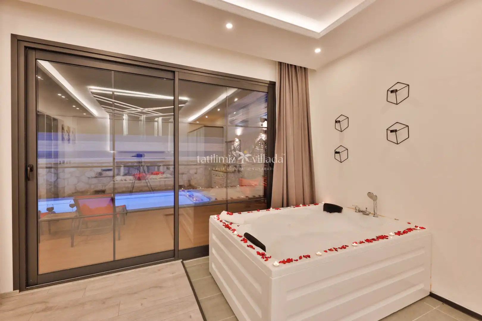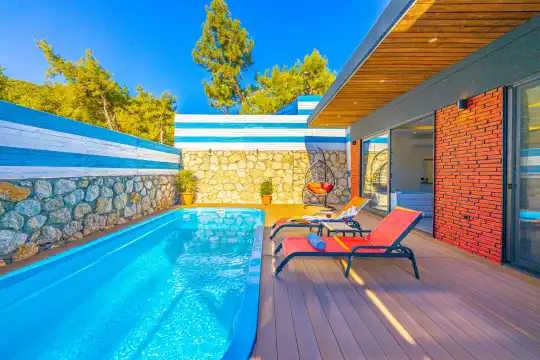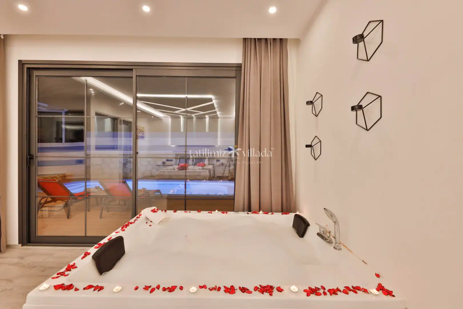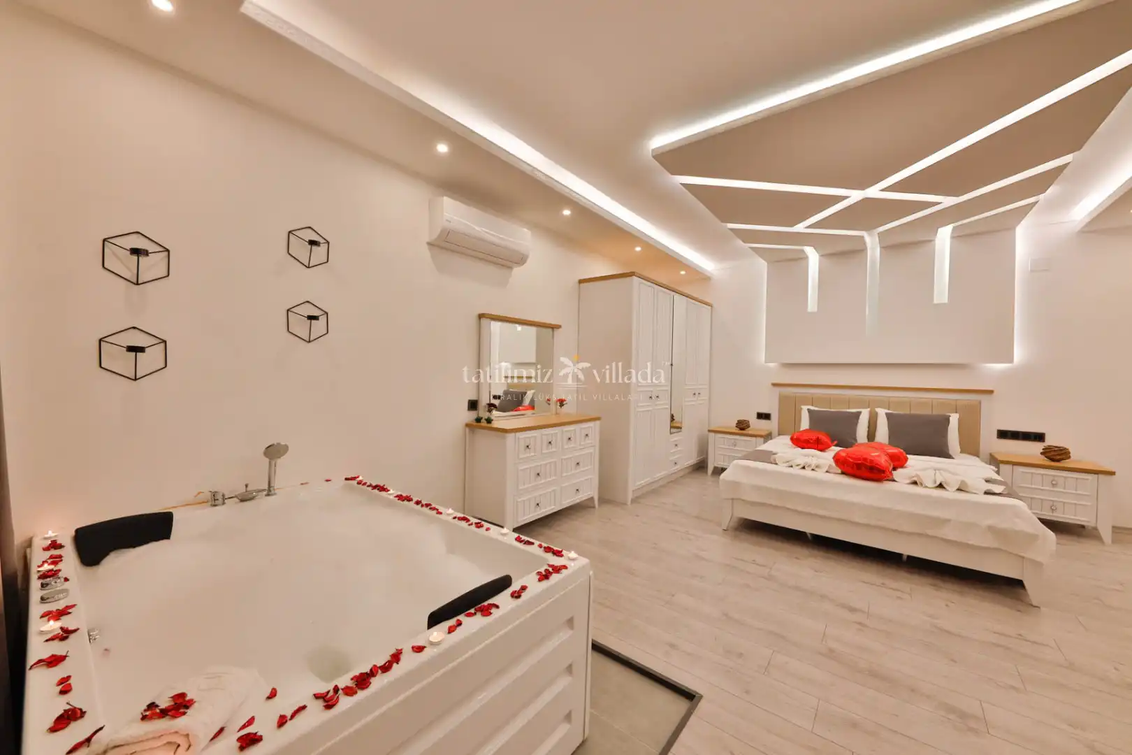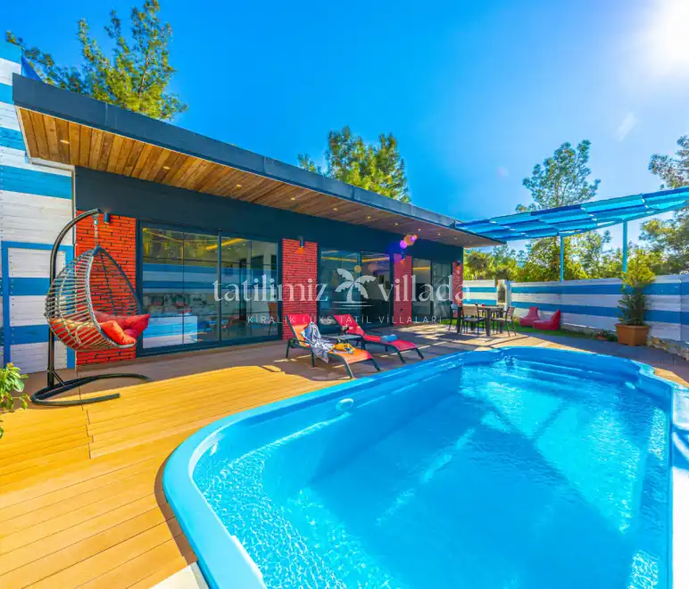 Renkli ve şirin iç mekan tasarımıyla sıcak bir atmosfer sunan villa, ebeveyn yatak odasında bulunan çift kişilik jakuzi ile konforu ön plana çıkarır. Açık otopark alanı ve barbekü bölümü sayesinde hem rahat ulaşım hem de keyifli akşam yemekleri için ideal bir ortam sunmaktadır. Doğayla iç içe, sakin ve huzurlu bir tatil arayan çiftler için özenle tasarlanmıştır.
