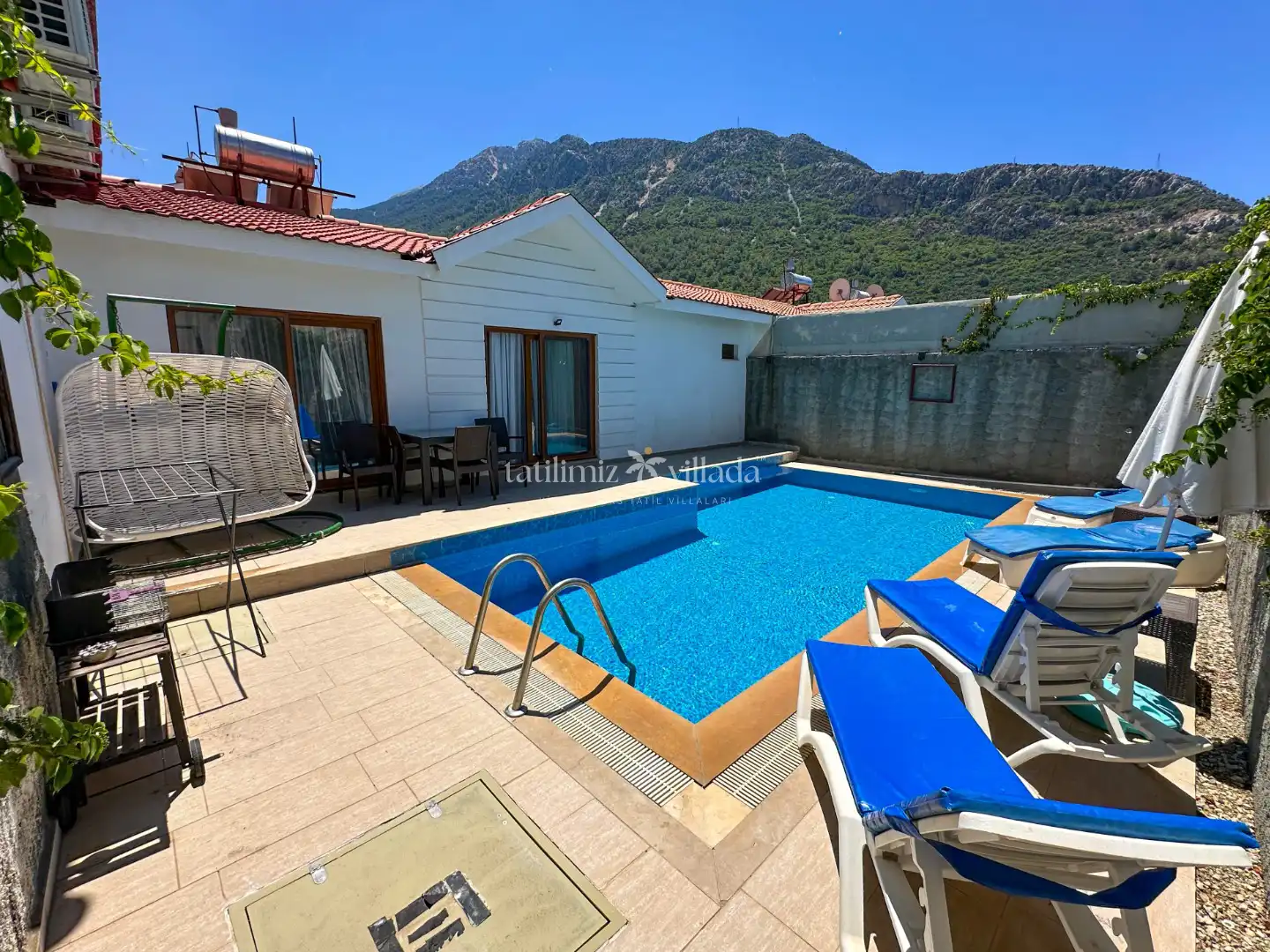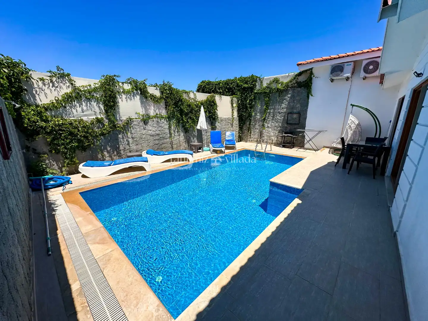 Villanın geniş ve özel kayıt havuzu, tatile çıkarken istenilen konforu sunuyor. Gün boyu havuzda yüzülebilir, güneşe bağlanabilir ve dinlendirilebilir. Havuzun tamamıyla korunaklı olduğu için, dışarıdan gözlemlerden uzak bir şekilde tatil keyfinin keyfini çıkarın.