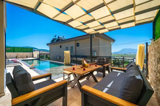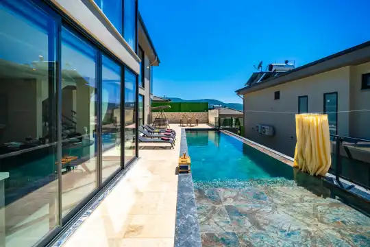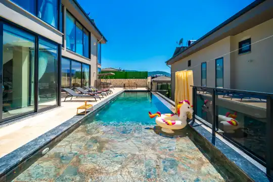 Dış mekanda yer alan özel yüzme havuzu ve güneşlenme alanı, doğayla baş başa keyifli vakit geçirmenizi sağlar. Havuz terası korunaklı yapıda olup, dışarıdan görünmeyecek şekilde tasarlanmıştır. Bu özelliği sayesinde muhafazakar aileler için de uygundur.
