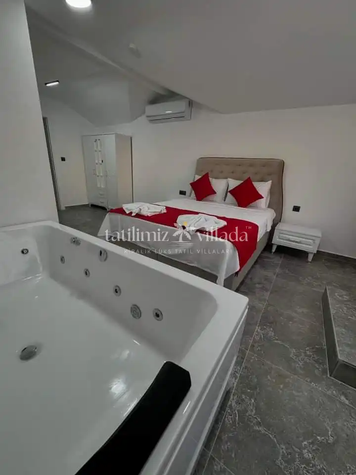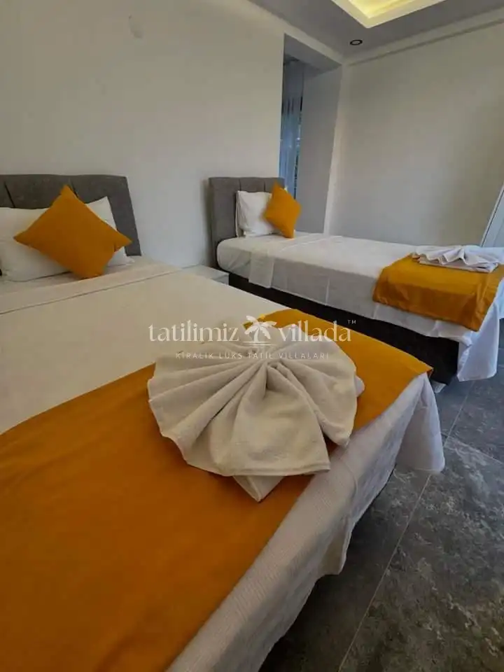Villamızda iki yatak odasında çift kişilik yatak, bir yatak odasında iki adet tek kişilik yatak bulunmaktadır. Tüm odalarda ebeveyn banyosu, klima, elbise dolabı yer almakta olup temiz nevresim ve havlu takımları mevcuttur. Geniş ve modern mutfakta buzdolabı, bulaşık ve çamaşır makinesi, fırın, ocak, kettle, yemek takımları ve mutfak araç gereçleri bulunmaktadır. Salon bölümünde oturma grubu, klima, LCD TV, uydu alıcısı ve yemek masası yer almaktadır.