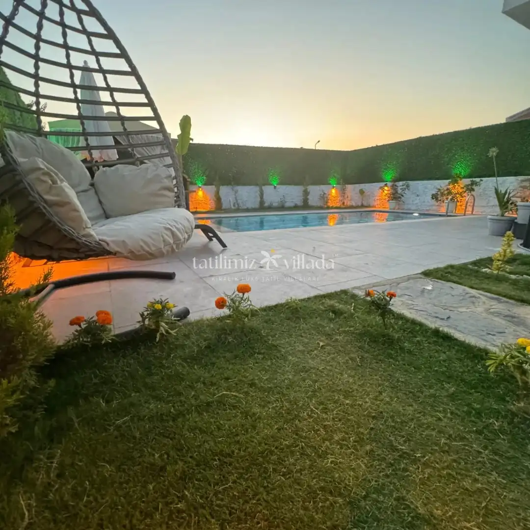 Bahçe ve havuz terasında şezlonglar, güneş şemsiyesi, barbekü ile yemek masası ve sandalyeler bulunmaktadır. Özel yüzme havuzu klor sistemi ile temizlenmekte olup 3,50 m x 7,00 m ölçülerinde ve 155 cm derinliğindedir. Villada kapalı havuz ve çocuk havuzu bulunmamaktadır. Kablosuz sınırsız internet ve salon ile tüm yatak odalarında klima mevcuttur.
