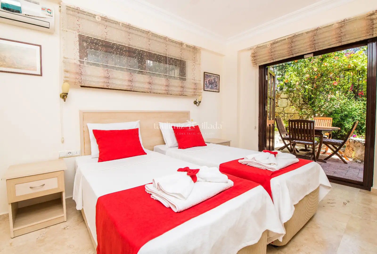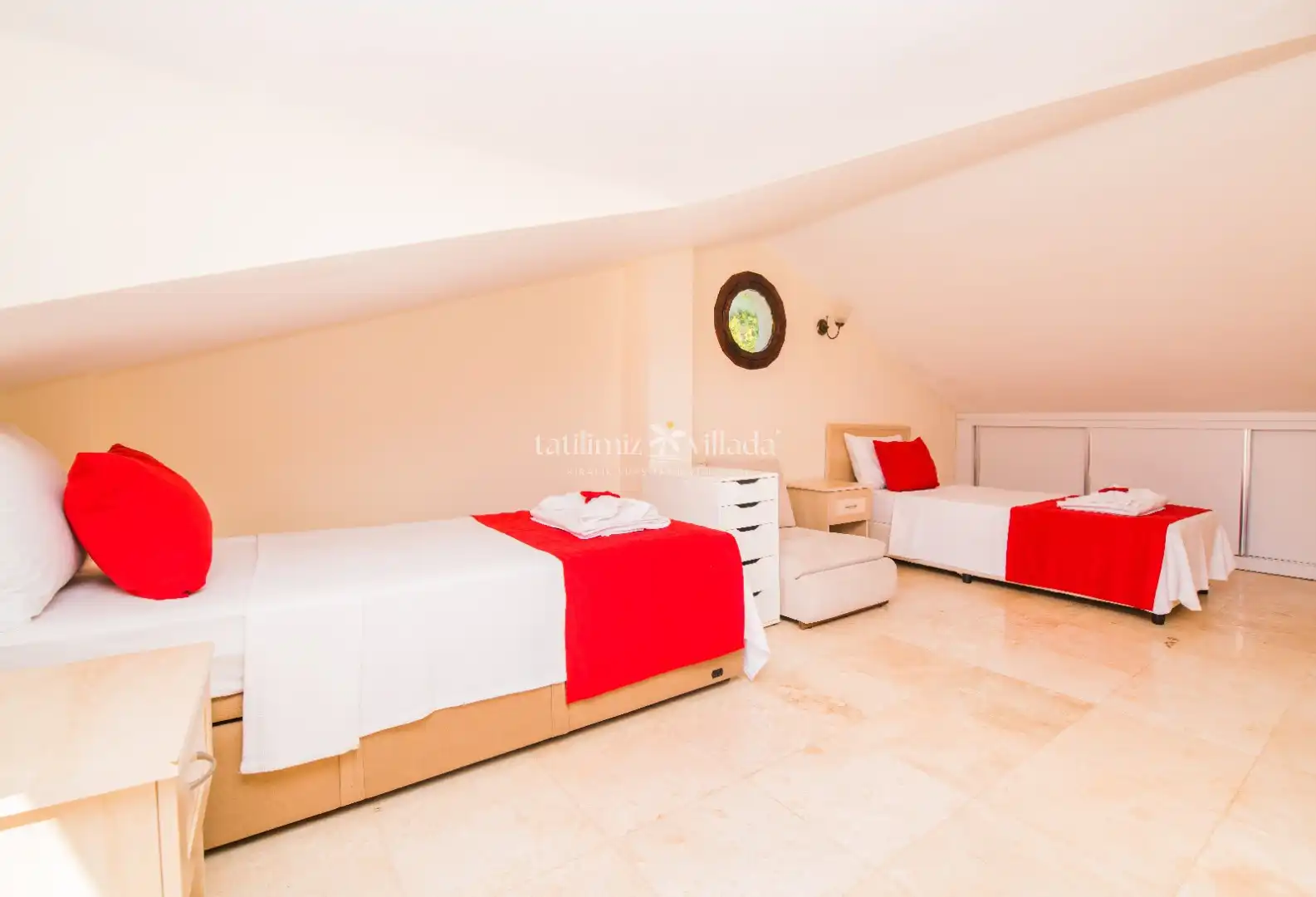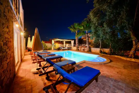 Villamızda beş adet yatak odası ve üç banyo bulunmaktadır. İki yatak odası içerisinde çift kişilik yatak ve klima bulunmaktadır. Üçüncü yatak odası içerisinde çift kişilik yatak, klima ve banyo bulunmaktadır. Dördüncü yatak odasında iki tek kişilik yatak ve klima bulunurken, diğer odada ise üç tek kişilik yatak ve klima mevcuttur. Salon içerisinde mutfak, oturma grubu, televizyon, klima ve iki banyo mevcuttur,Ayrıca mama sandalyesi ve bebek yatağı mevcuttur.