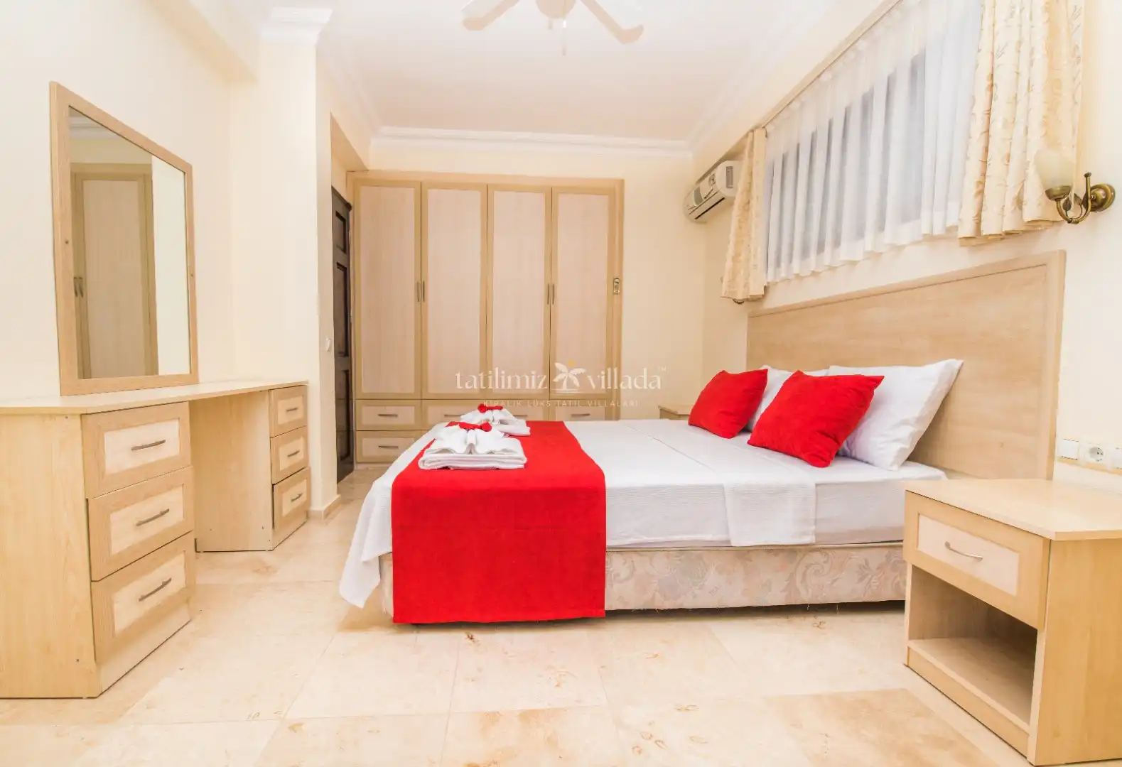 Yatak odalarımızın tamamında; klima , elbise dolabı ,makyaj masası,komidin bulunmaktadır.