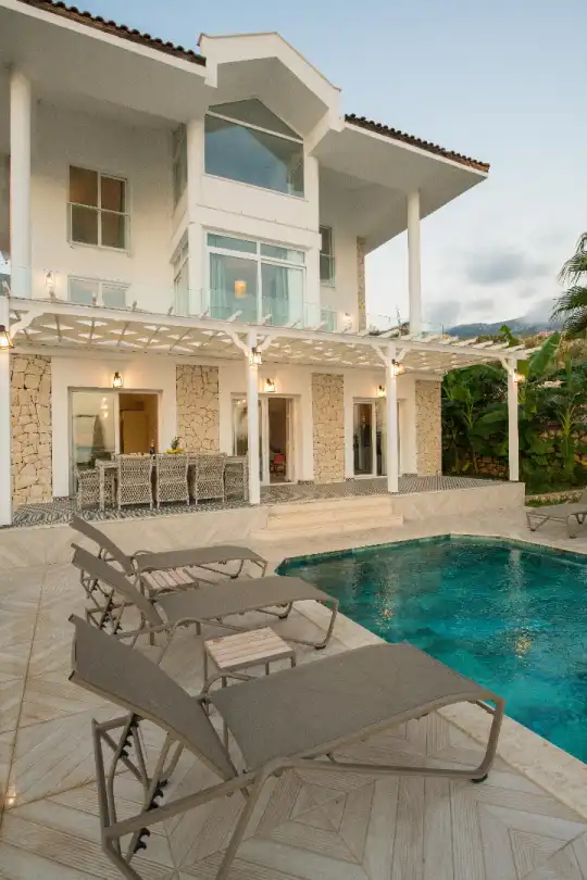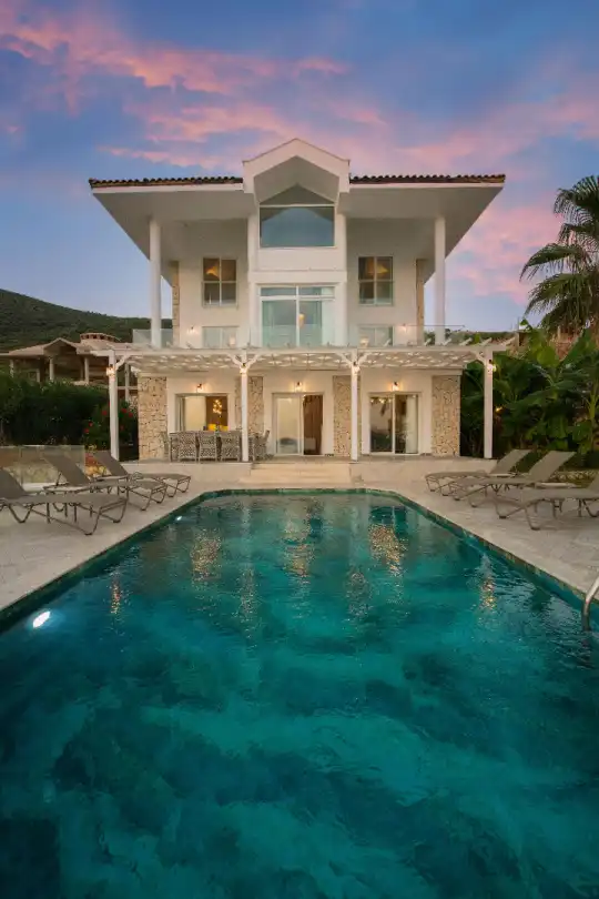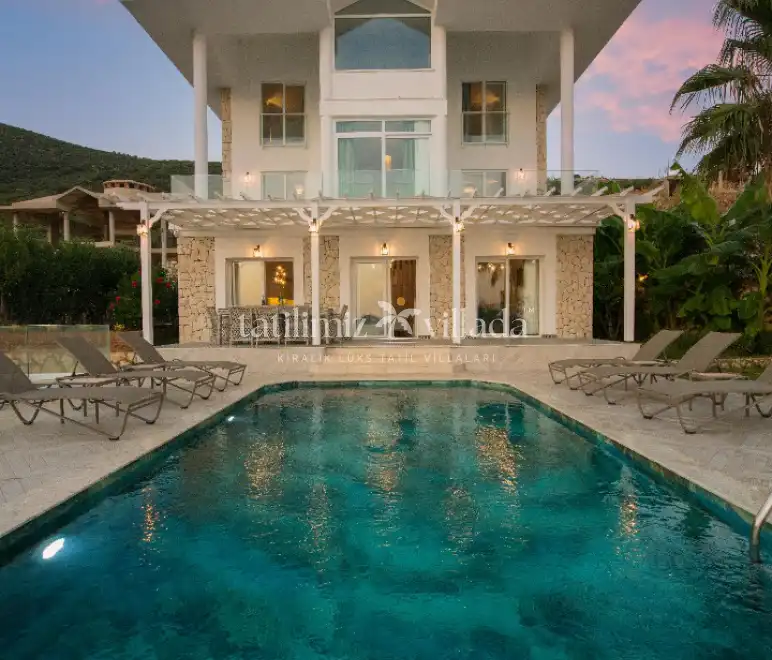 Lüks mimarisi ve şık dizaynı ile öne çıkan villamız, modern detaylarla özenle dekore edilmiş 4 yatak odası ve 8 kişilik konaklama kapasitesine sahiptir. Gözlerden uzak, sakin ve huzurlu bir atmosferde sevdiklerinizle birlikte keyifli bir tatil geçirmek isteyen misafirler için elit bir yaşam alanı sunmaktadır. Bu yönüyle hem deniz manzaralı kiralık villa arayanlara hem de doğayla iç içe tatil planlayanlara hitap etmektedir.