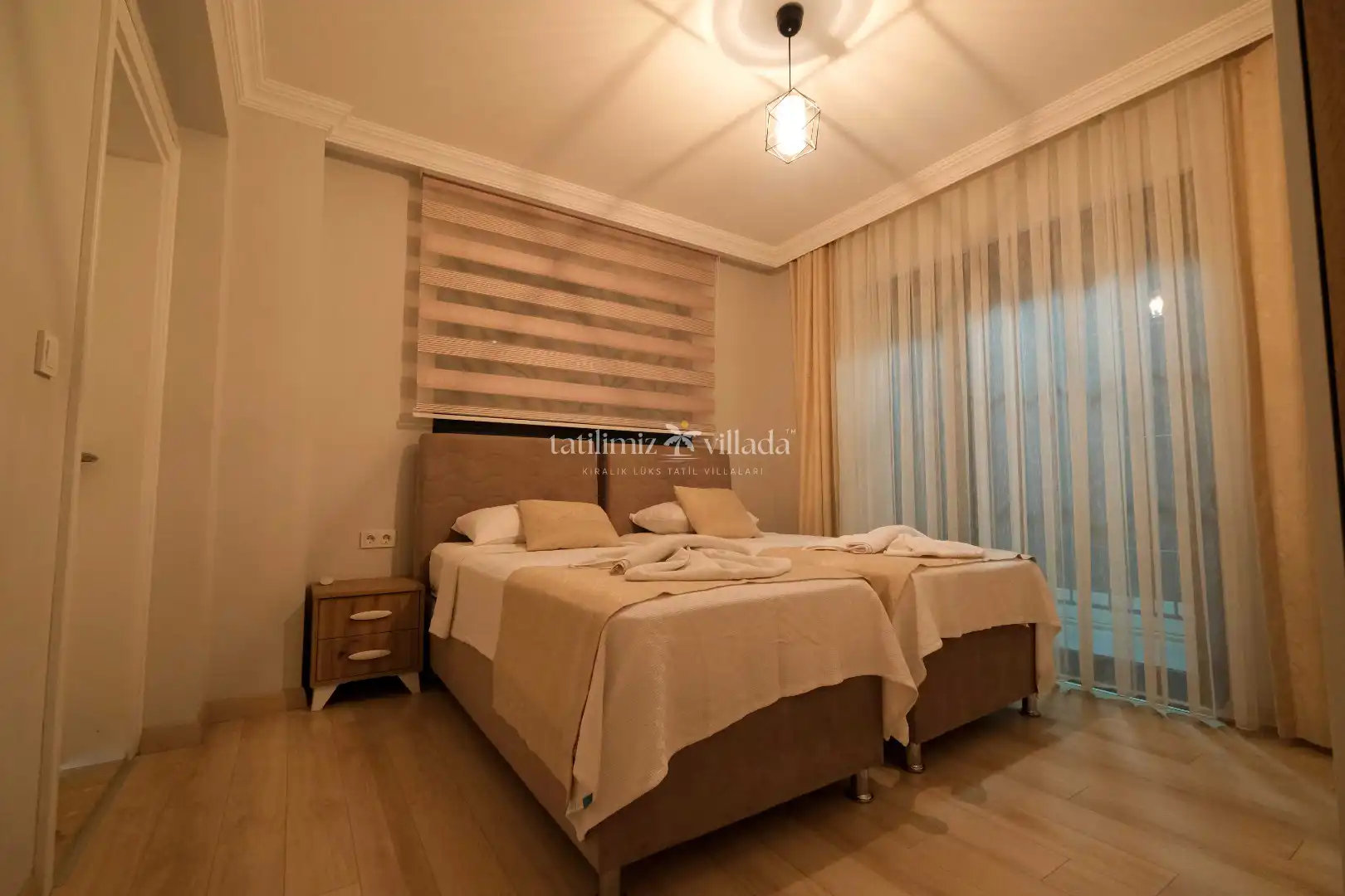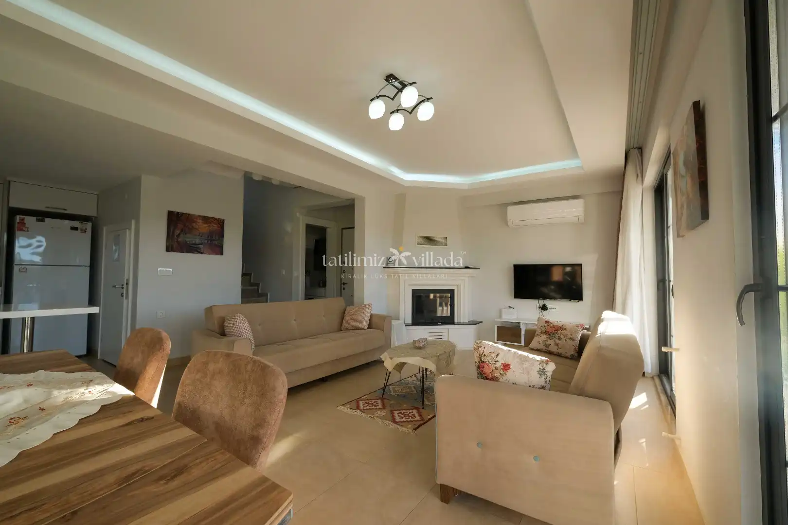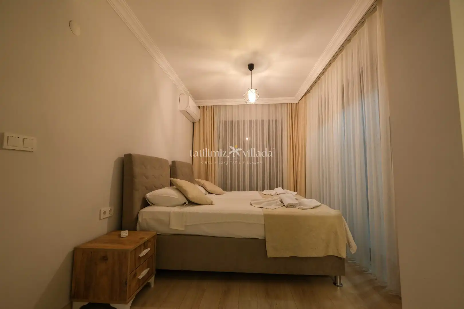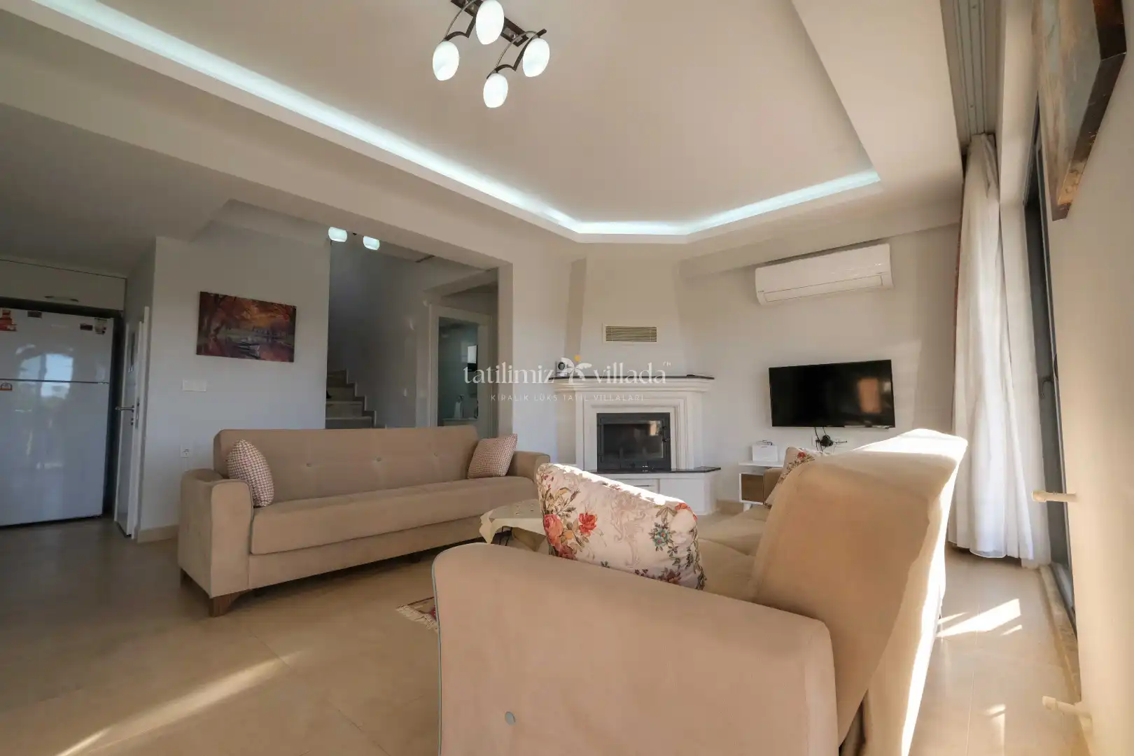 Villanın iç dekorasyonu modern ve kullanışlı şekilde tasarlanmış olup, her odada konfor ön planda tutulmuştur. Tam donanımlı mutfağı sayesinde misafirler kendi yemeklerini hazırlayabilir, geniş oturma alanında ise dinlenmenin keyfini çıkarabilir. Özel yüzme havuzu, güneşlenme terası ve bakımlı bahçesi ile misafirlerine keyifli vakit geçirebilecekleri özel alanlar sunar.