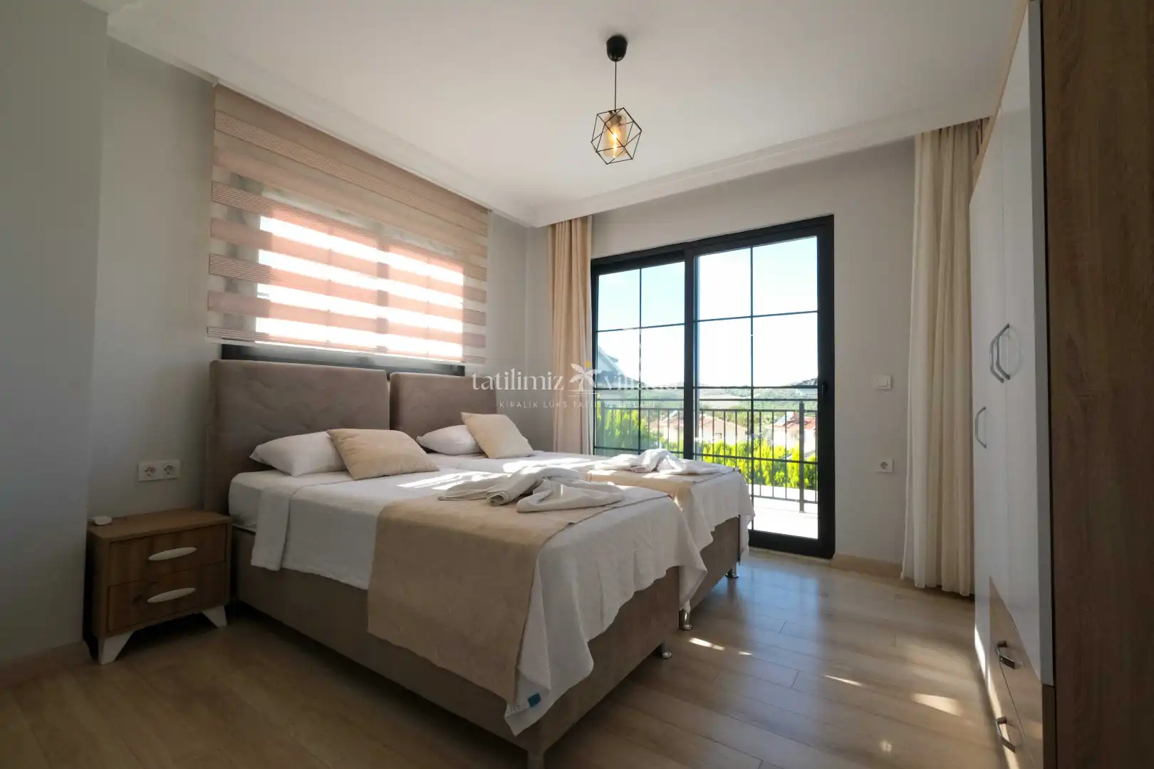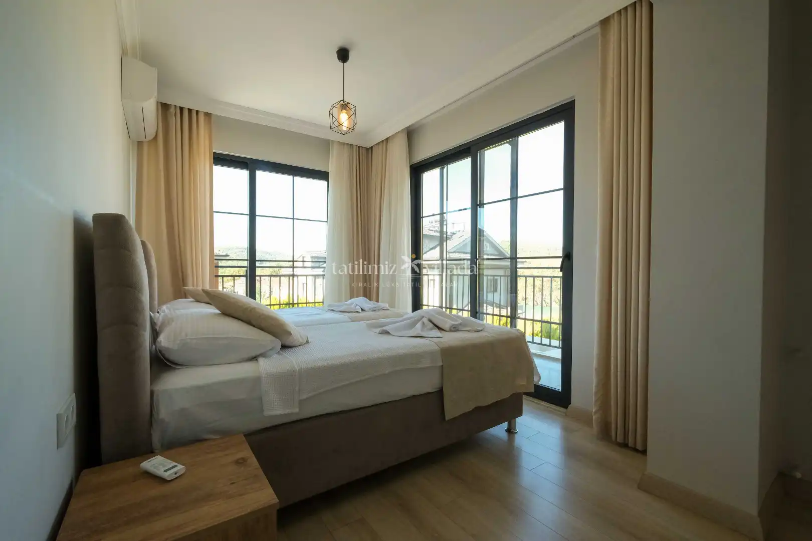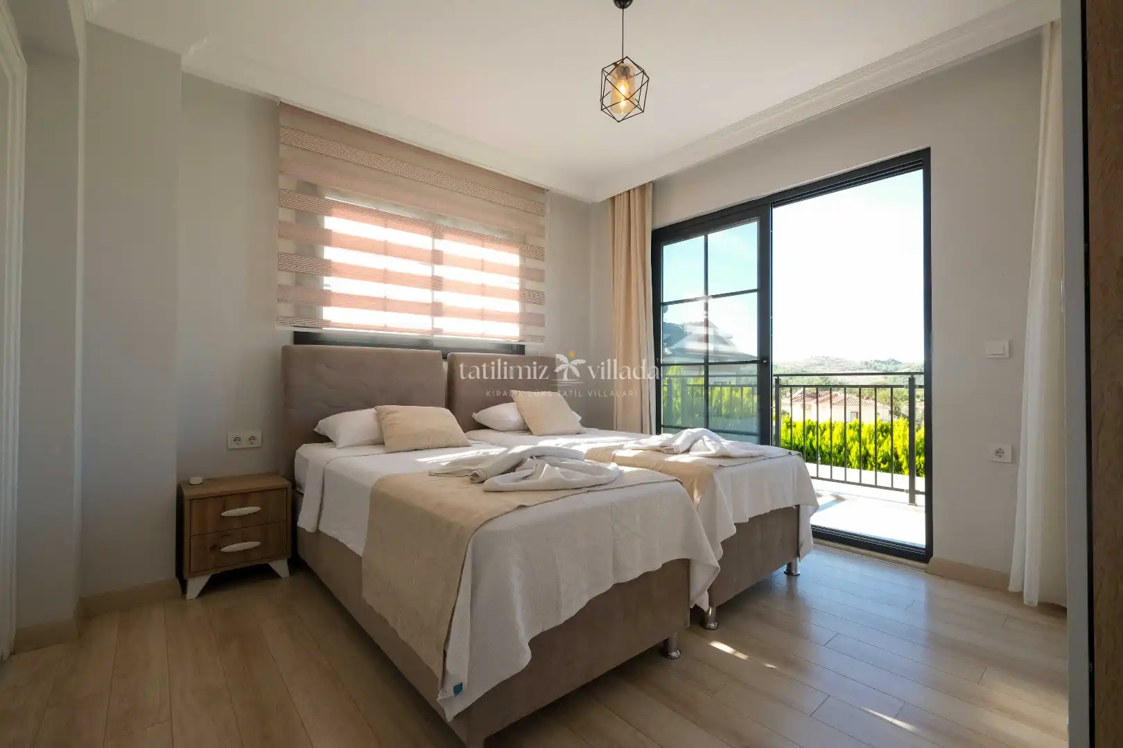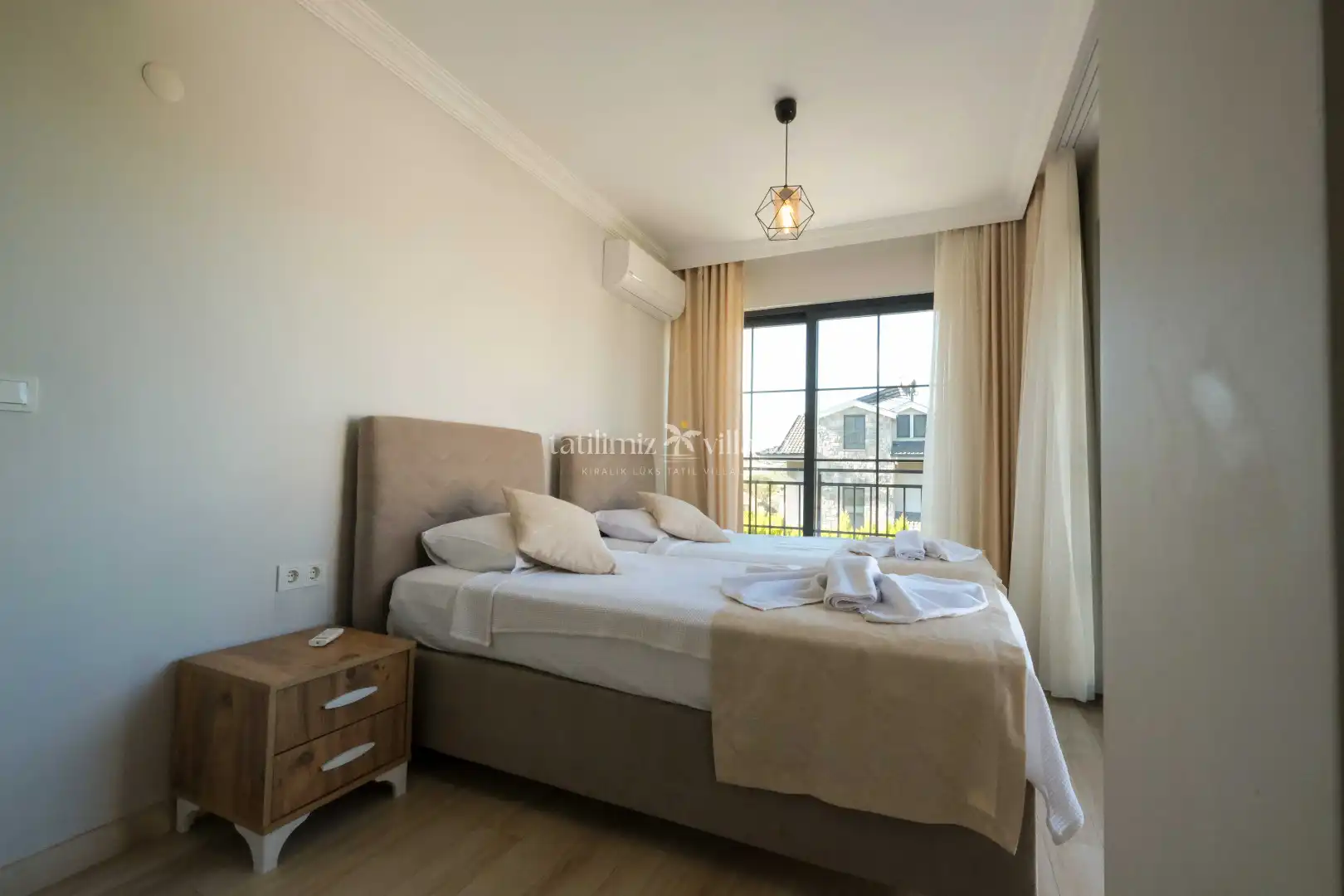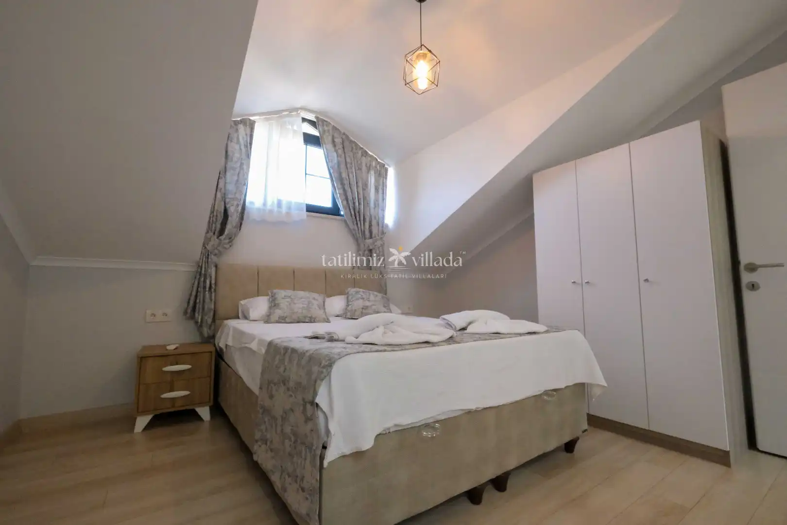 Villanın iç dekorasyonu modern ve kullanışlı şekilde tasarlanmış olup, her odada konfor ön planda tutulmuştur. Tam donanımlı mutfağı sayesinde misafirler kendi yemeklerini hazırlayabilir, geniş oturma alanında ise dinlenmenin keyfini çıkarabilir. Özel yüzme havuzu, güneşlenme terası ve bakımlı bahçesi ile misafirlerine keyifli vakit geçirebilecekleri özel alanlar sunar.