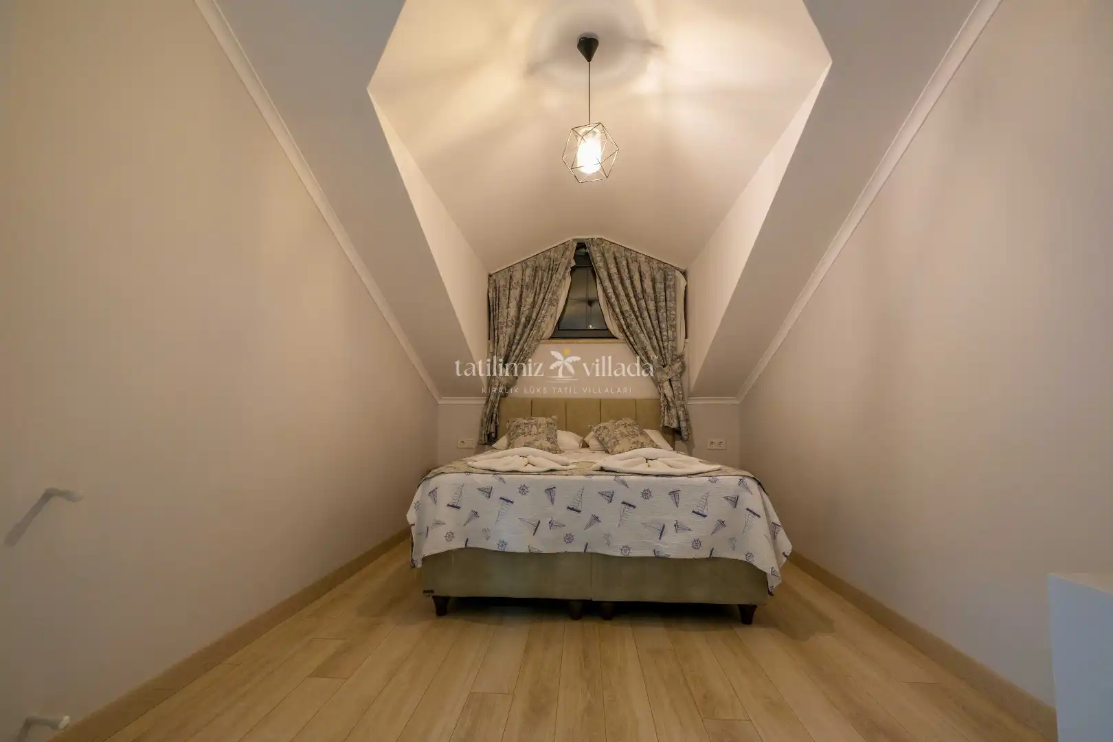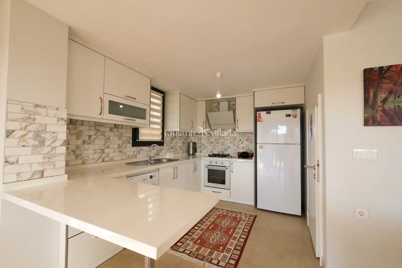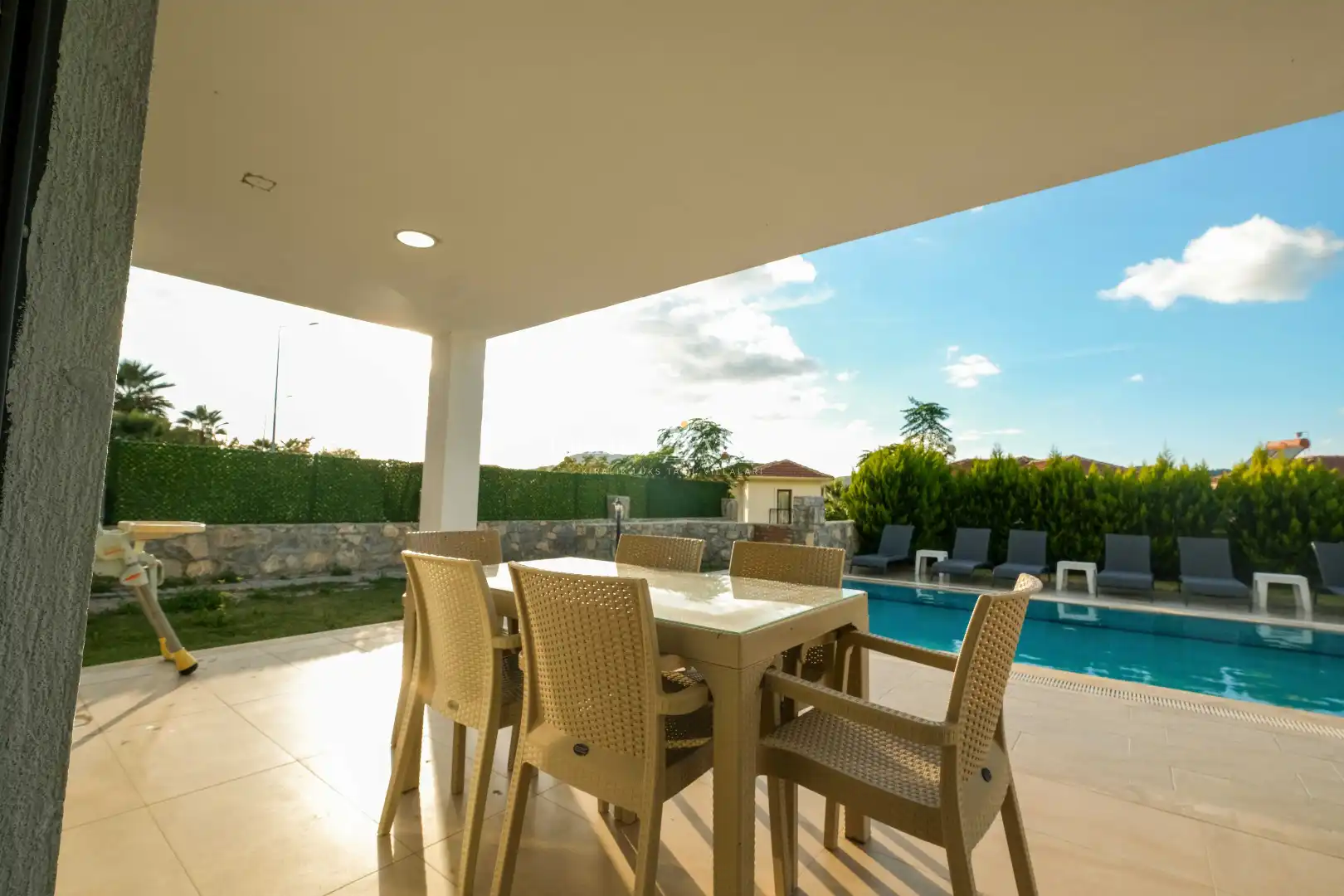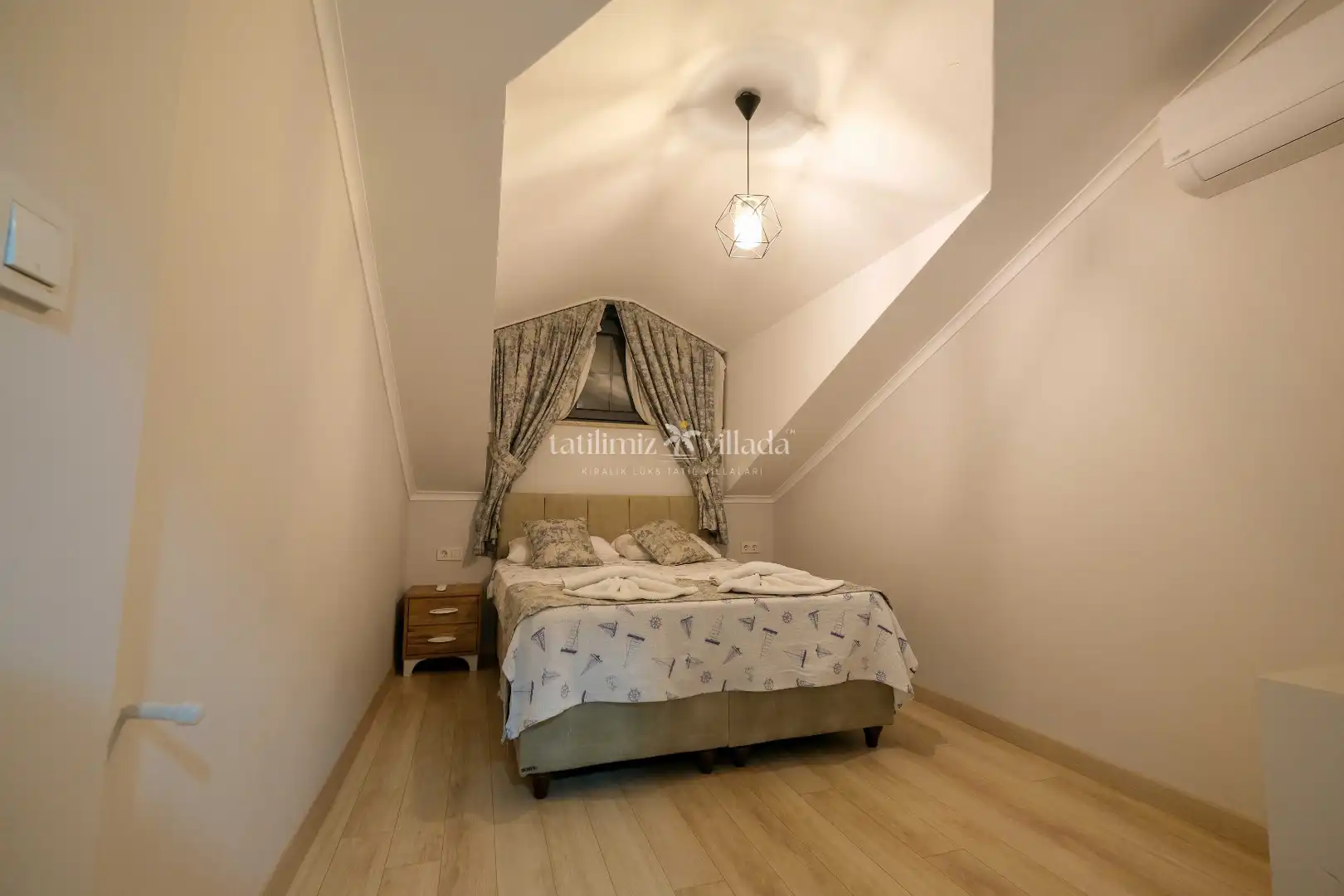 Villanın iç dekorasyonu modern ve kullanışlı şekilde tasarlanmış olup, her odada konfor ön planda tutulmuştur. Tam donanımlı mutfağı sayesinde misafirler kendi yemeklerini hazırlayabilir, geniş oturma alanında ise dinlenmenin keyfini çıkarabilir. Özel yüzme havuzu, güneşlenme terası ve bakımlı bahçesi ile misafirlerine keyifli vakit geçirebilecekleri özel alanlar sunar.