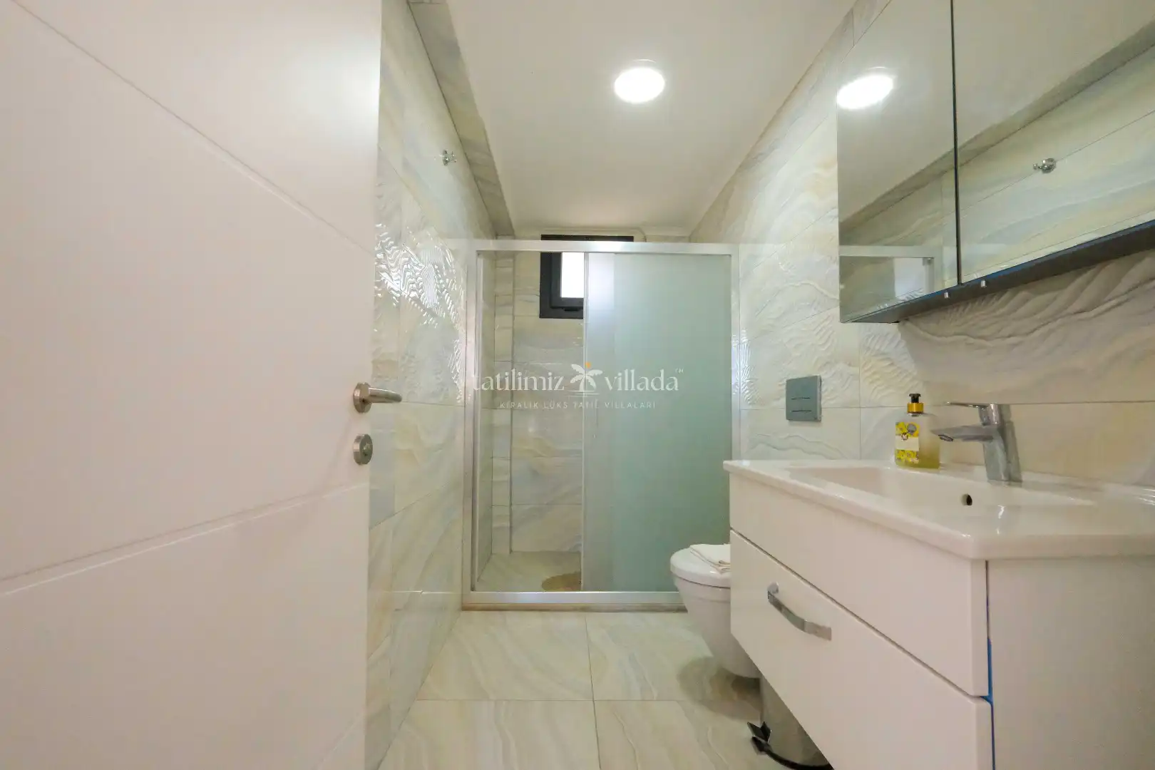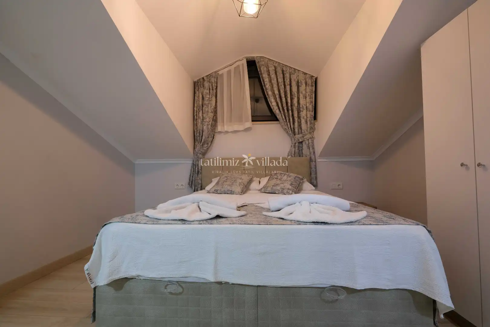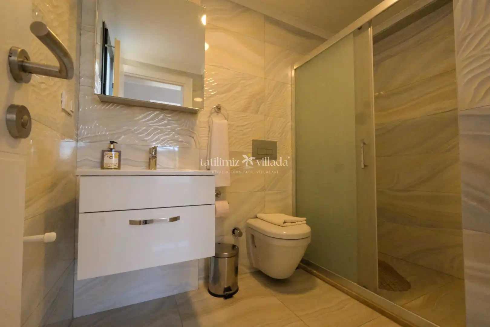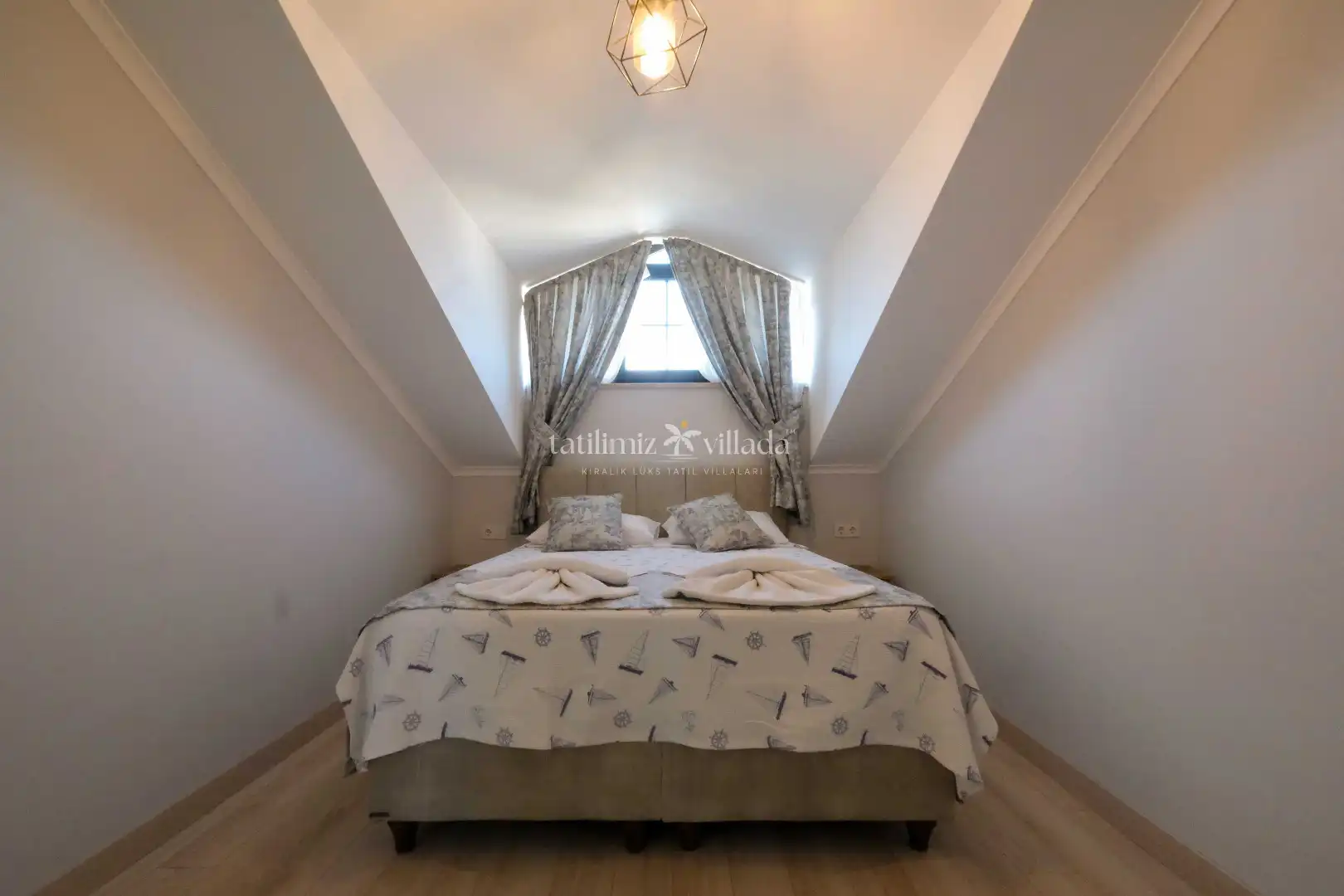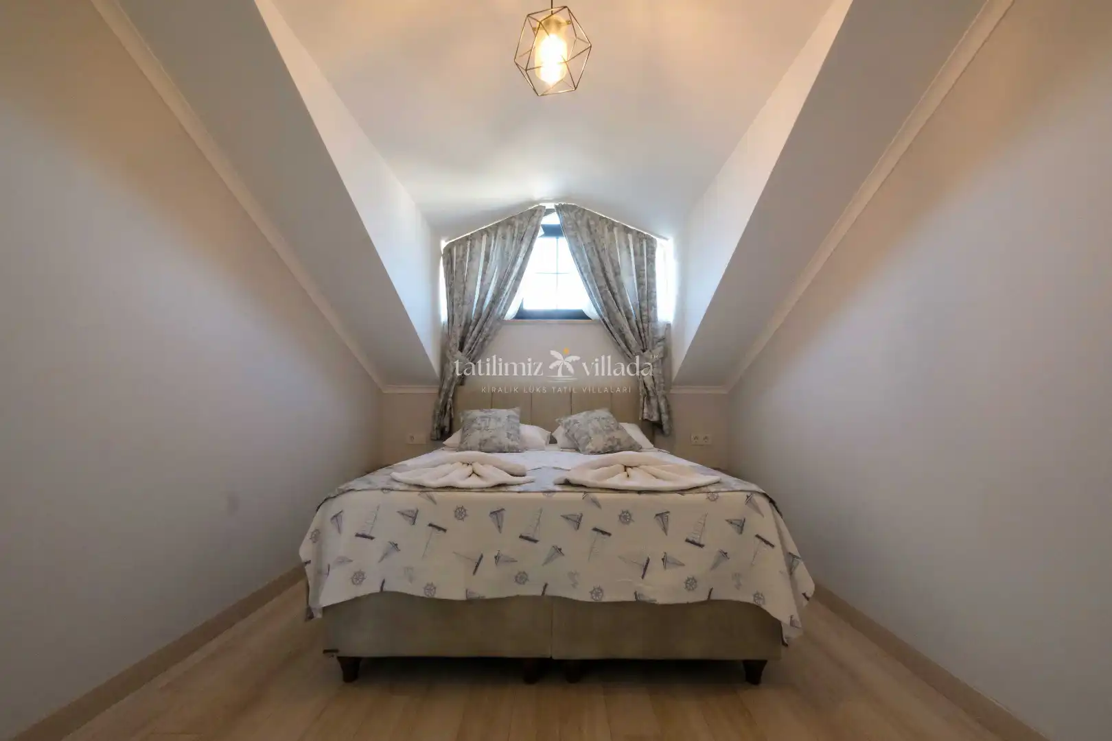 Villanın iç dekorasyonu modern ve kullanışlı şekilde tasarlanmış olup, her odada konfor ön planda tutulmuştur. Tam donanımlı mutfağı sayesinde misafirler kendi yemeklerini hazırlayabilir, geniş oturma alanında ise dinlenmenin keyfini çıkarabilir. Özel yüzme havuzu, güneşlenme terası ve bakımlı bahçesi ile misafirlerine keyifli vakit geçirebilecekleri özel alanlar sunar.