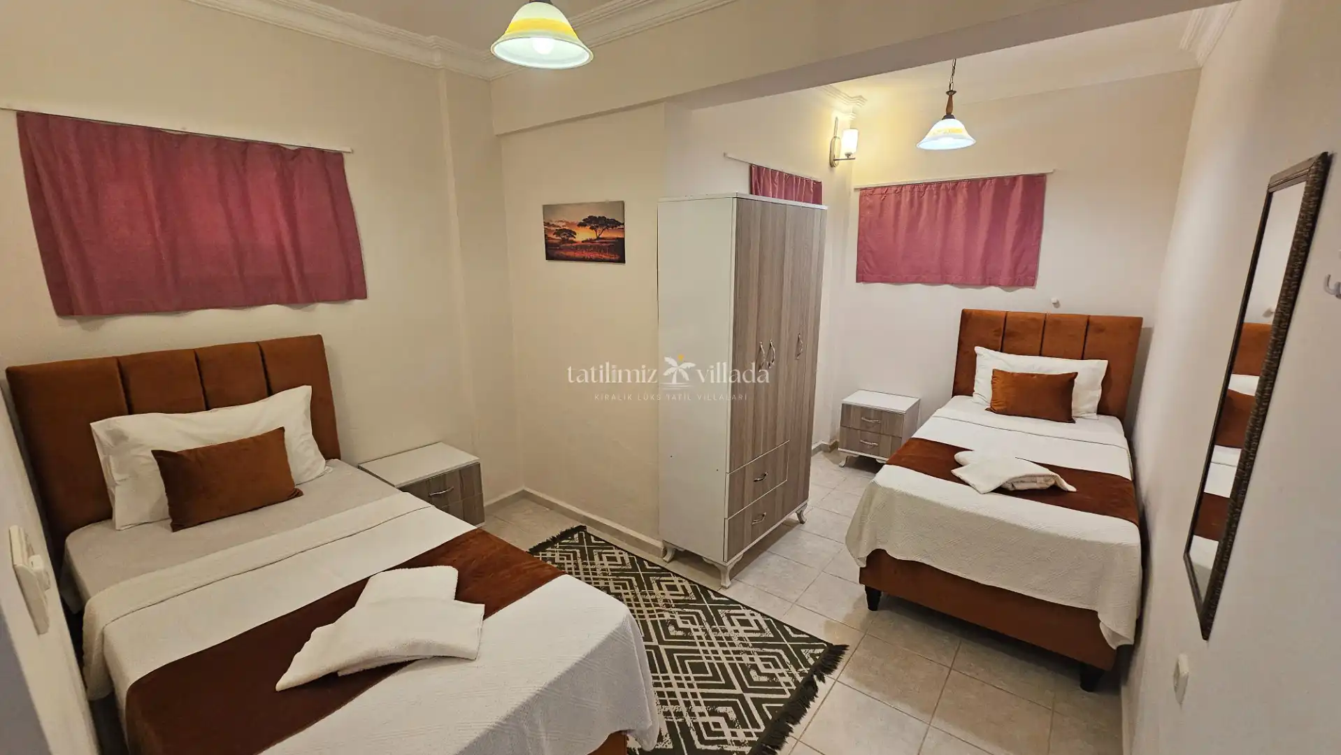 Villa Ertek’in özel yüzme havuzu, geniş bahçesi ve ferah yaşam alanları, tatilinizi keyifli ve rahatlatıcı hale getirir. Modern mutfağı, geniş oturma alanları ve rahat yatak odaları ile misafirler ev konforunda bir tatil deneyimi yaşar. Doğa ile iç içe konumu, ferah yapısı ve merkezi avantajları ile hem dinlenmek hem de bölgenin sunduğu tüm imkânlara kolayca ulaşmak isteyen misafirler için ideal bir villadır.