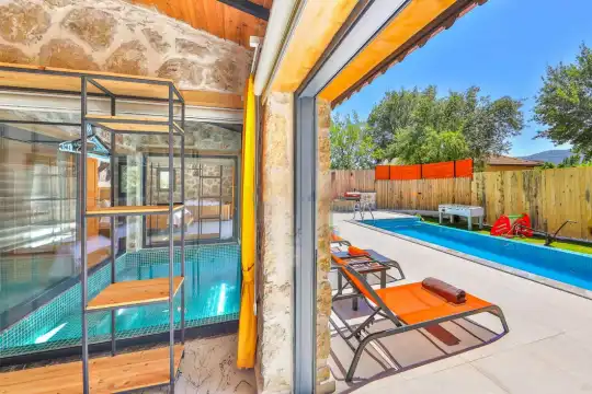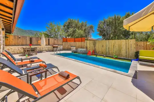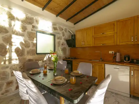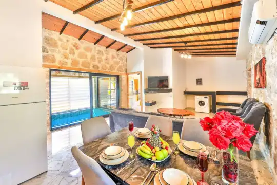 Kalkan Bezirgan mevkiinde bulunan villa, 2 yatak odasıyla 5 kişilik konaklama kapasitesi sunmaktadır. Doğa manzarasına hakim, genişliği ile göz dolduran villa, çekirdek aile ve balayı çiftleri için uygundur.