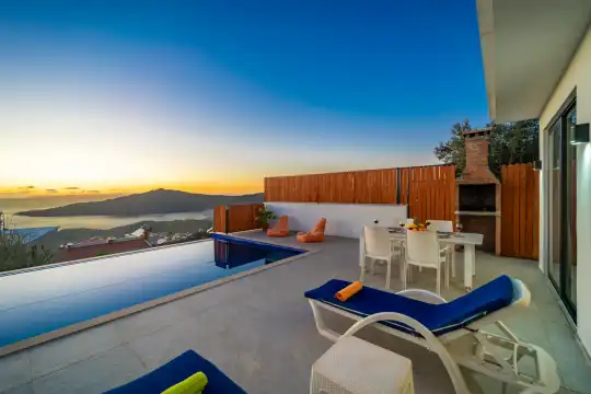 Doğa ve deniz manzarasını kuş bakışı izleyebileceğiniz Villa Glor, modern mimarisi ve konforlu iç tasarımıyla huzurlu bir tatil atmosferi sunar. Korunaklı havuz ve bahçe alanı sayesinde muhafazakâr aileler ve balayı çiftleri için güvenli ve özel bir konaklama imkânı sağlar. Dışarıdan görünmeyecek şekilde planlanan havuz alanı, tamamen size ait bir tatil deneyimi sunar.