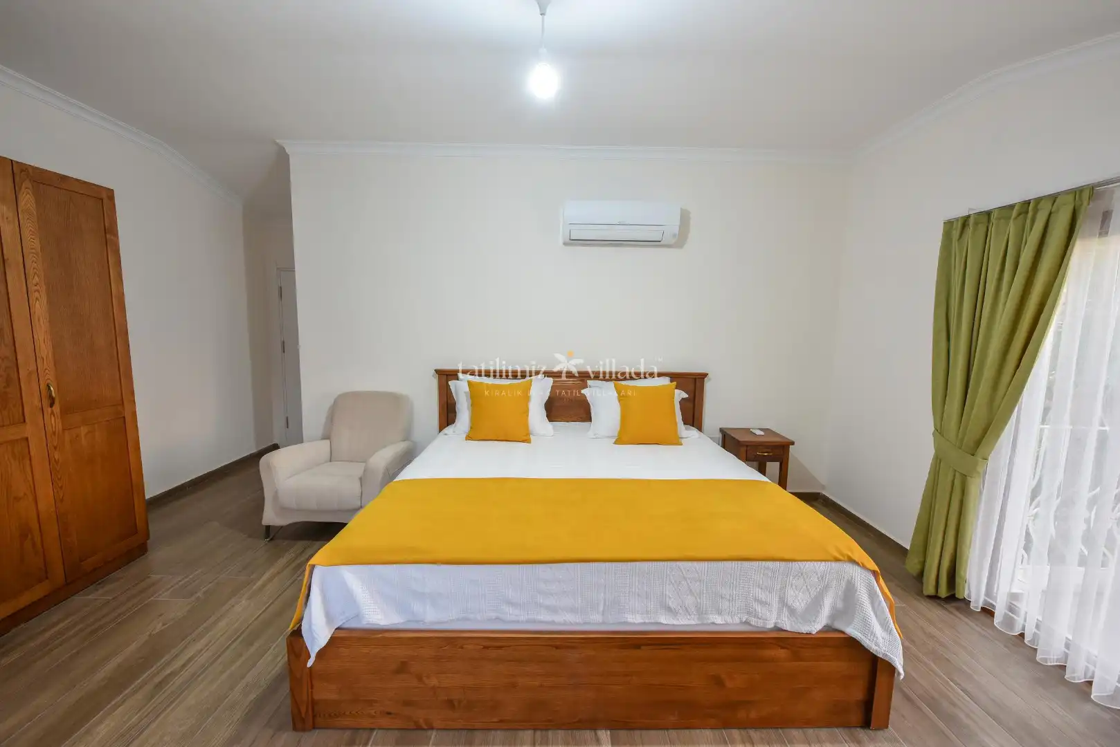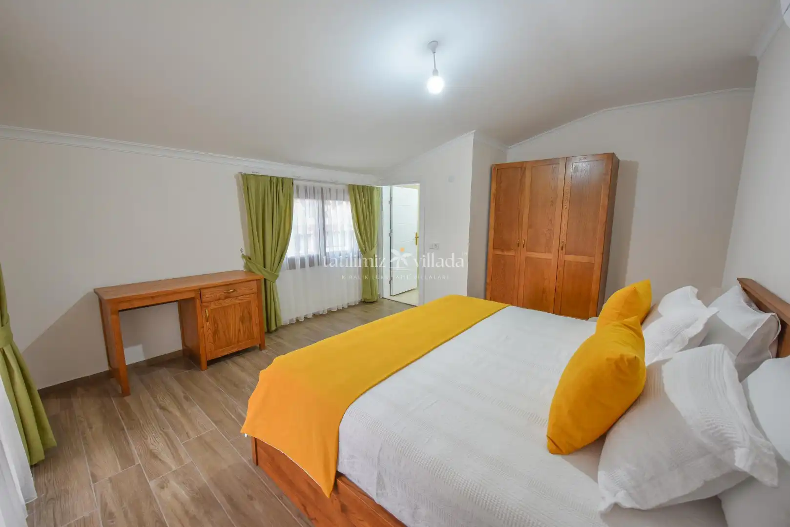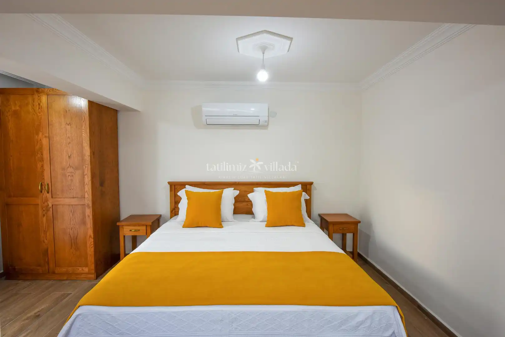Villanın iç mekanında şık ve modern bir dekorasyon hakim. Geniş pencereler, bol doğal ışık almanızı sağlarken, açık renk tonlarıyla ferah bir atmosfer yaratılmış. Oturma odasında konforlu mobilyalar, geniş ekran televizyon ve dinlenme alanları bulunuyor. Mutfakta ise modern cihazlar, yüksek kaliteli ankastre ürünler ve geniş çalışma alanları mevcut. Aynı zamanda yemek alanı, rahatça bir araya gelebileceğiniz geniş bir masaya sahip. Yatak odalarında ise her birine özel banyo ve tuvalet alanlarıyla maksimum konfor sağlanmış. Geniş ve konforlu yataklar, tatilinizin her anında rahat bir uyku deneyimi sunuyor.