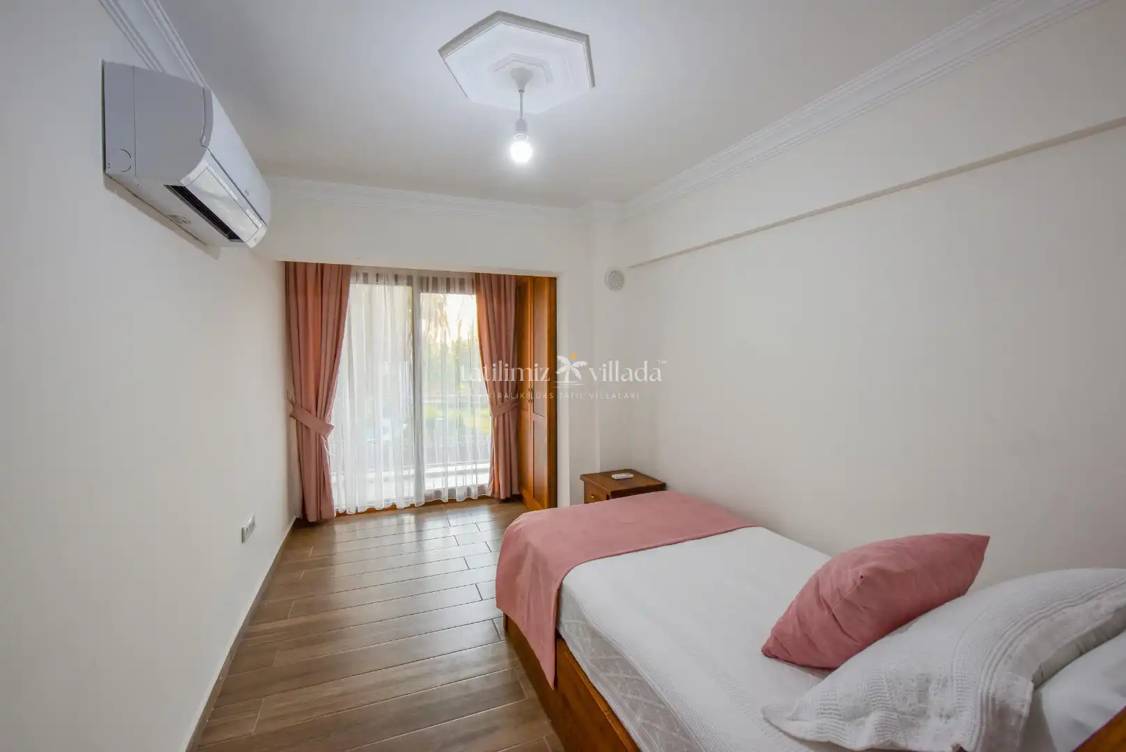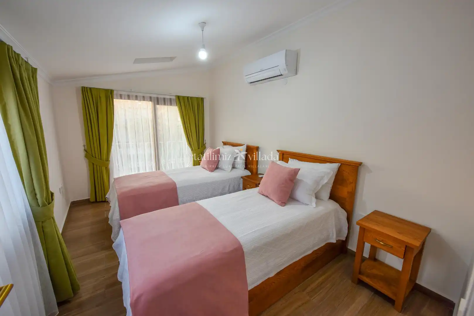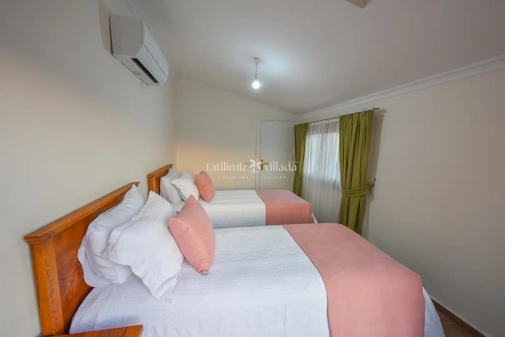 Villanın iç mekanında şık ve modern bir dekorasyon hakim. Geniş pencereler, bol doğal ışık almanızı sağlarken, açık renk tonlarıyla ferah bir atmosfer yaratılmış. Oturma odasında konforlu mobilyalar, geniş ekran televizyon ve dinlenme alanları bulunuyor. Mutfakta ise modern cihazlar, yüksek kaliteli ankastre ürünler ve geniş çalışma alanları mevcut. Aynı zamanda yemek alanı, rahatça bir araya gelebileceğiniz geniş bir masaya sahip. Yatak odalarında ise her birine özel banyo ve tuvalet alanlarıyla maksimum konfor sağlanmış. Geniş ve konforlu yataklar, tatilinizin her anında rahat bir uyku deneyimi sunuyor.