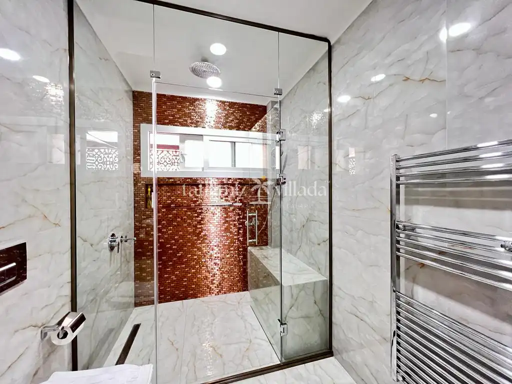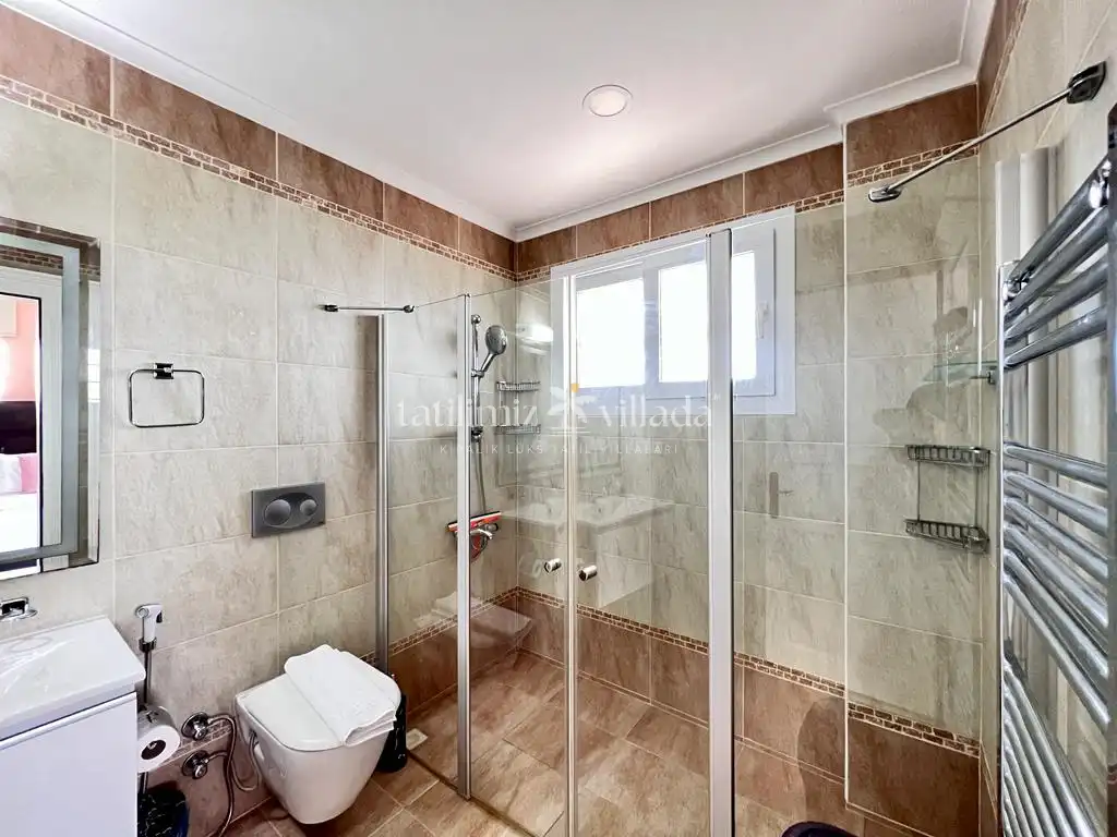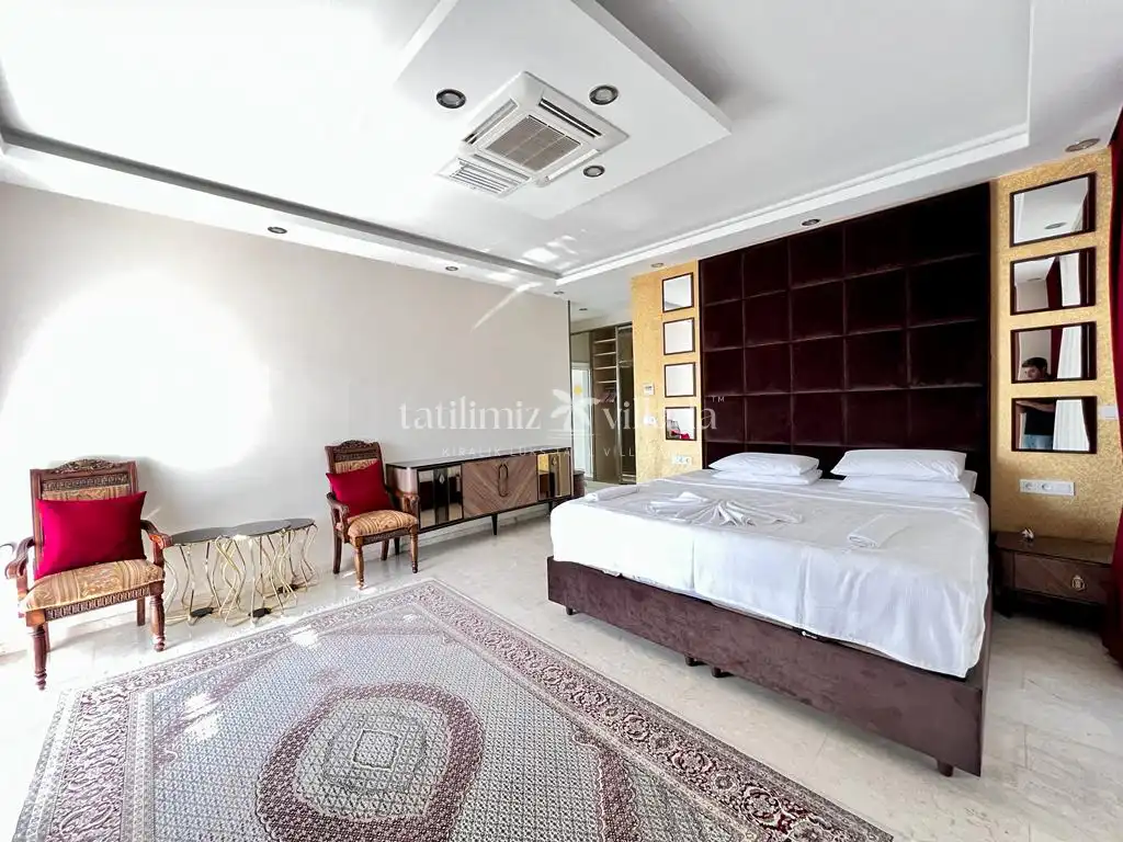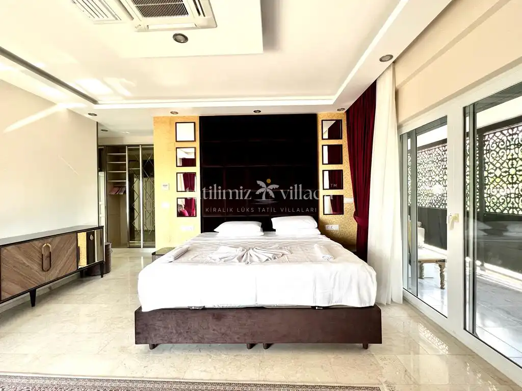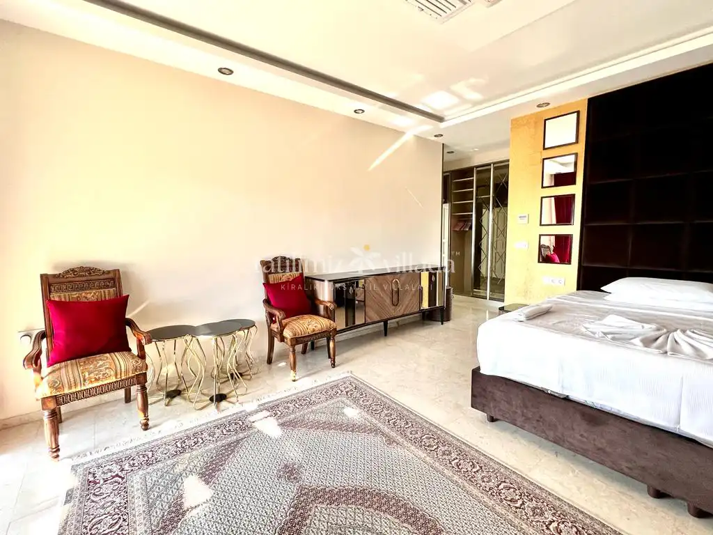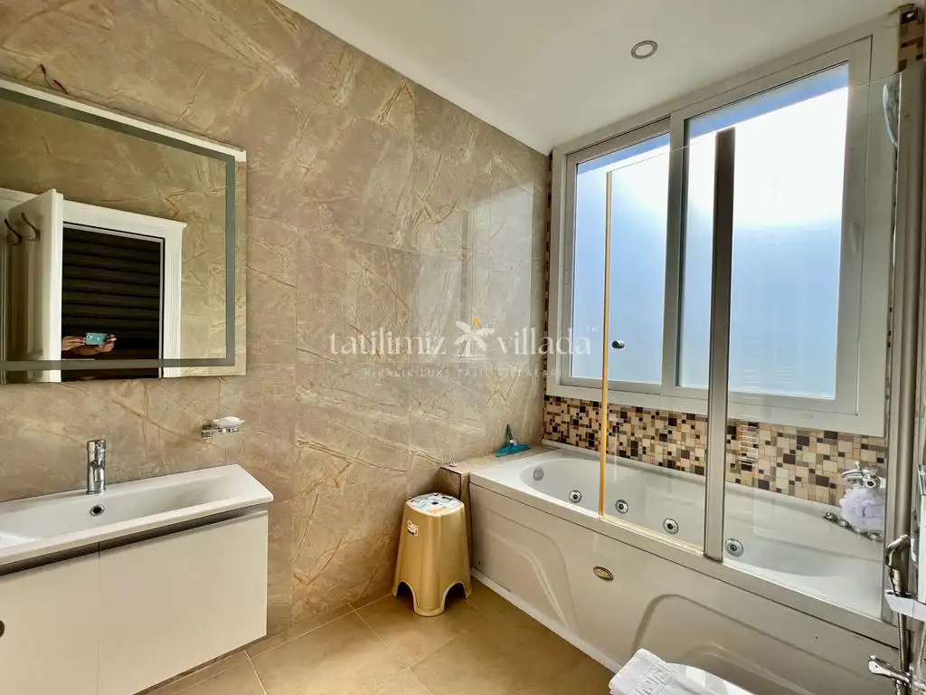 Villada bulunan geniş yüzme havuzu ve 12 kişiye kadar kullanım imkânı sunan özel jakuzi, tatilinizi daha keyifli ve ayrıcalıklı hale getirir. Bahçe alanında yer alan kraliçe boy kabanalar ve rahat şilteler, gün boyu dinlenmeniz için ideal alanlar oluşturur. Barbekü alanına bitişik olarak konumlandırılmış büyük çardak, gölgeli ve konforlu bir açık oturma alanı sunarken; sevdiklerinizle keyifli anlar geçirmenize olanak tanır.