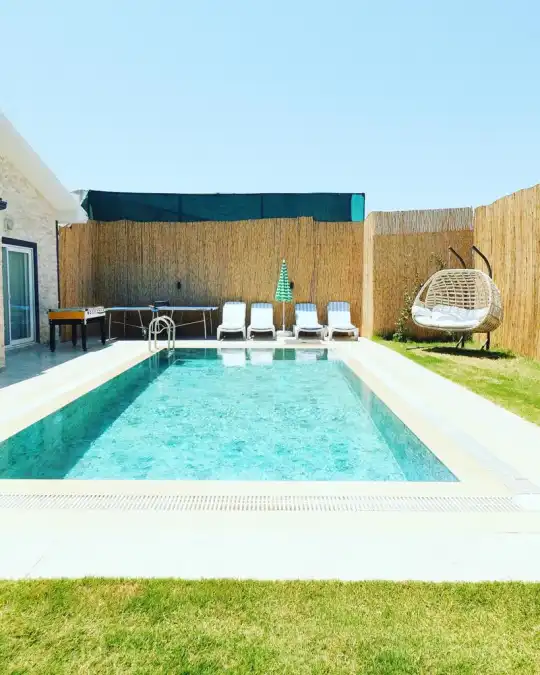 Villada tamamen korunaklı özel bir yüzme havuzu bulunmaktadır. Bu sayede dışarıdan görünmeden rahatça yüzebilir, güneşlenebilir ve günün tadını özgürce çıkarabilirsiniz. Geniş bahçesi misafirlerin keyifli vakit geçirebilmesi için özenle düzenlenmiştir. Bahçede barbekü (BBQ) alanı, masa tenisi ve langırt gibi eğlenceli aktiviteler yer almaktadır.