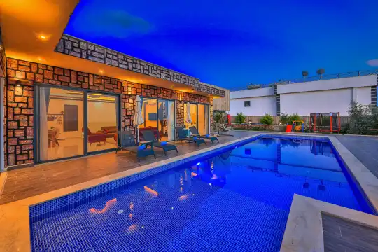 Dış mekânda ise tamamen korunaklı özel yüzme havuzu, geniş güneşlenme terası ve keyifli vakit geçirebileceğiniz oturma alanları yer alıyor. Bu alanlar dışarıdan görünmeyecek şekilde tasarlanmış olup, mahremiyeti ön planda tutan misafirler için özel olarak planlanmıştır. Gün içinde havuzun keyfini çıkarabilir, akşam saatlerinde doğa içinde huzur dolu sohbetlere dalabilirsiniz.