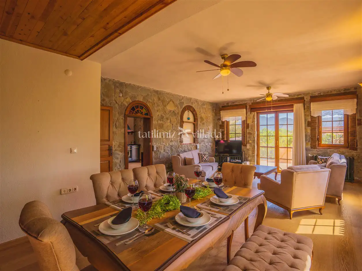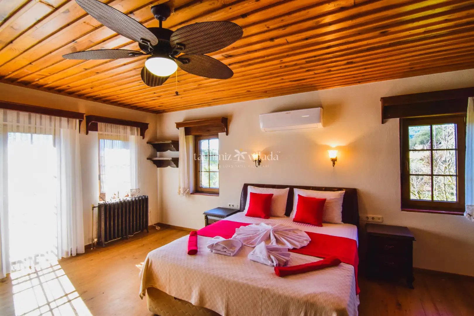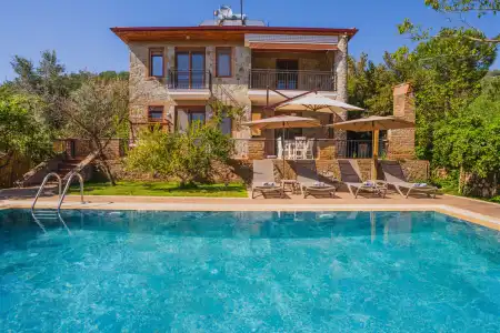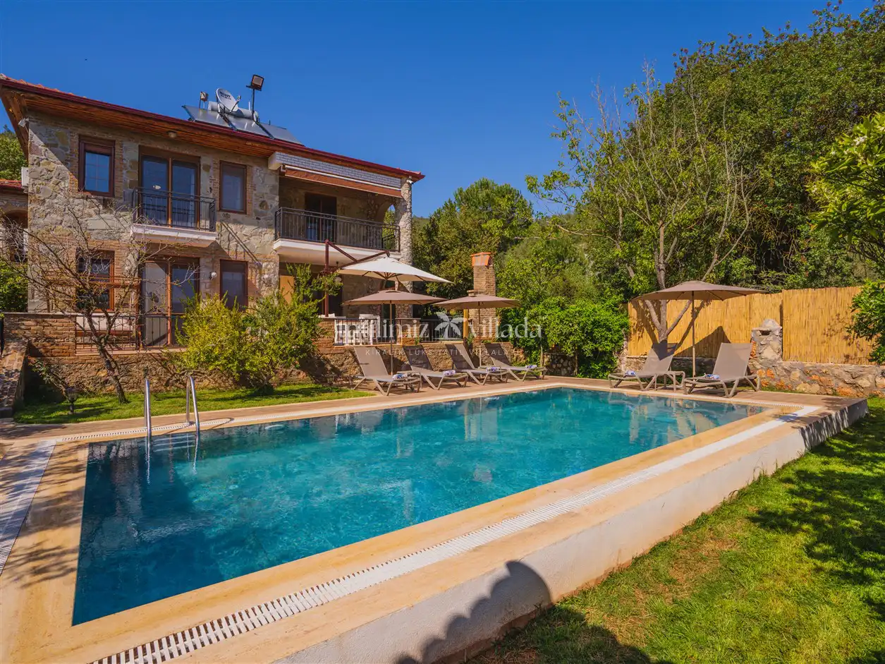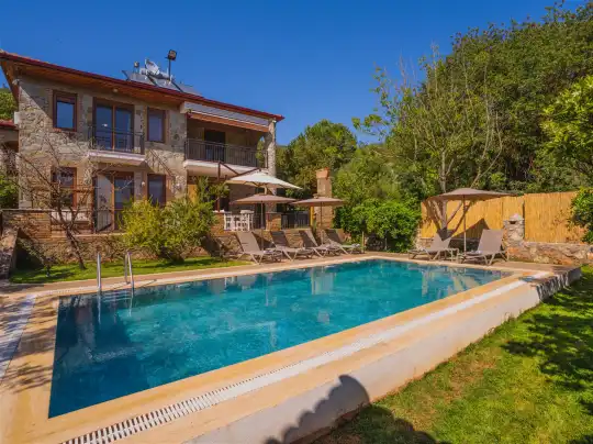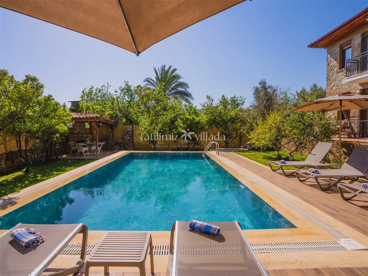 Taş ve ahşap mimarinin en güzel örneklerinden biri olan villamız, otantik dokusu ile modern konforu bir araya getirir. Özel yüzme havuzu ve havuz terası tam korunaklı olup dışarıdan görünmemektedir. Bu özelliği sayesinde özellikle fethiye muhafazakar kiralık villa arayışında olan misafirler için oldukça uygundur.